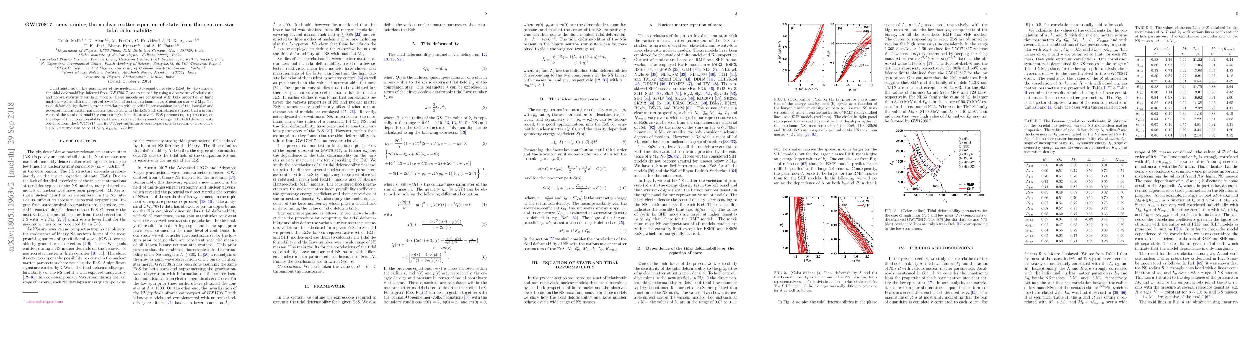 This paper examines constraints on the nuclear matter equation of state (EoS) using tidal deformability from the GW170817 neutron star merger, finding strong correlations between tidal deformability and EoS parameters. The study sets a radius for a $1.4~{\rm M}_{\odot}$ neutron star between $11.82$ and $13.72$ km.
