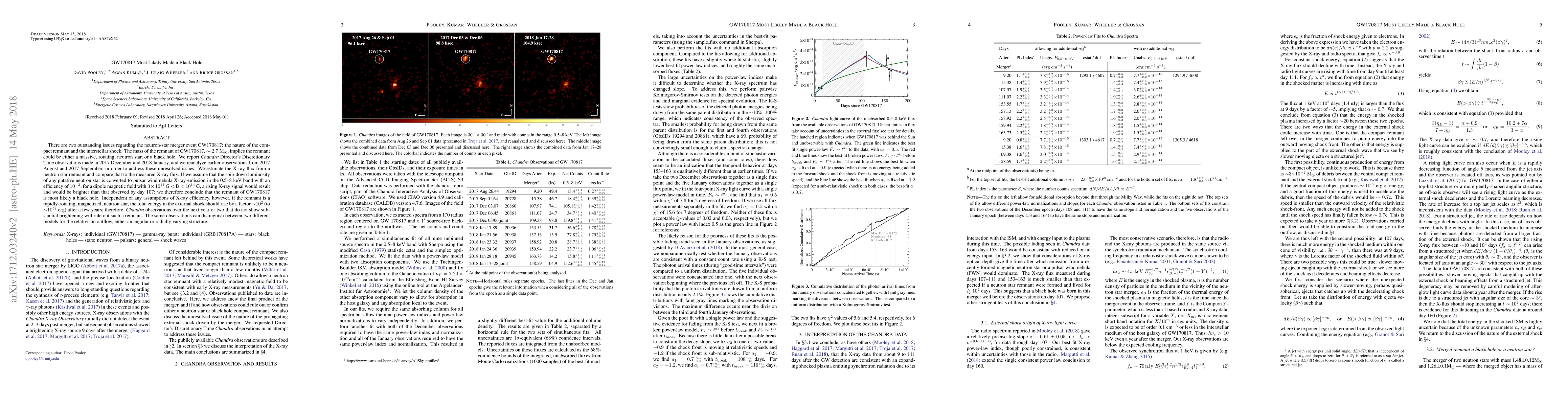There are two outstanding issues regarding the neutron-star merger event GW170817: the nature of the compact remnant and the interstellar shock. The mass of the remnant of GW170817, $\sim$2.7 $M_\odot$, implies the remnant could be either a massive, rotating, neutron star, or a black hole. We report Chandra Director's Discretionary Time observations made in 2017 December and 2018 January, and we reanalyze earlier observations from 2017 August and 2017 September, in order to address these unresolved issues. We estimate the X-ray flux from a neutron star remnant and compare that to the measured X-ray flux. If we assume that the spin-down luminosity of any putative neutron star is converted to pulsar wind nebula X-ray emission in the 0.5-8 keV band with an efficiency of $10^{-3}$, for a dipole magnetic field with $3 \times 10^{11}$ G < $B$ < $10^{14}$ G, a rising X-ray signal would result and would be brighter than that observed by day 107, we therefore conclude that the remnant of GW170817 is most likely a black hole. Independent of any assumptions of X-ray efficiency, however, if the remnant is a rapidly-rotating, magnetized, neutron star, the total energy in the external shock should rise by a factor $\sim$$10^2$ (to $\sim$$10^{52}$ erg) after a few years, therefore, Chandra observations over the next year or two that do not show substantial brightening will rule out such a remnant. The same observations can distinguish between two different models for the relativistic outflow, either an angular or radially varying structure.