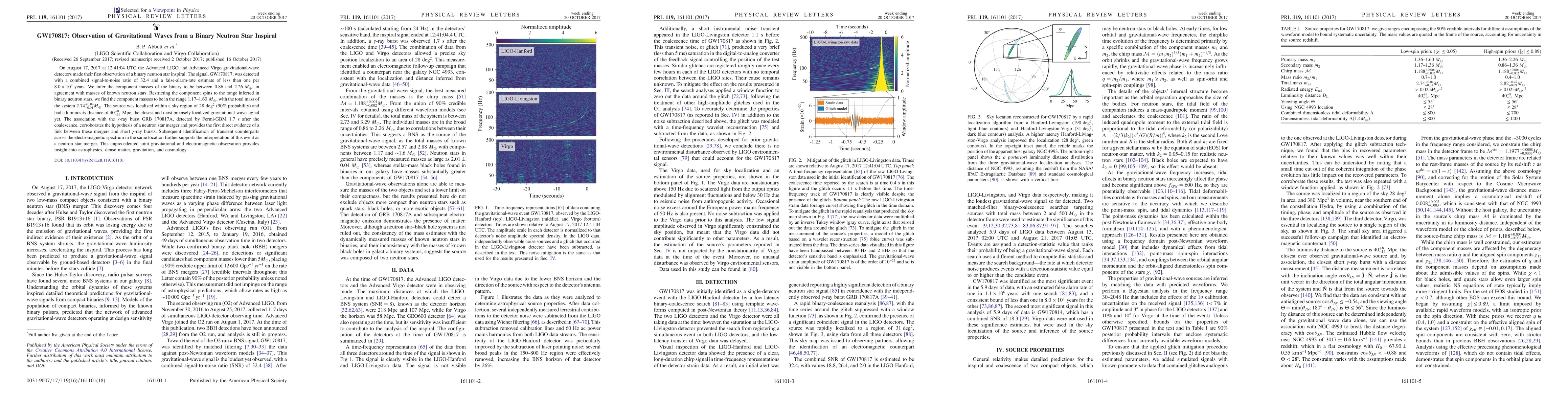 The LIGO and Virgo detectors observed GW170817, the first gravitational wave signal from a binary neutron star inspiral, confirming the merger of neutron stars and linking it to a short gamma-ray burst, GRB 170817A, marking a breakthrough in multi-messenger astrophysics.