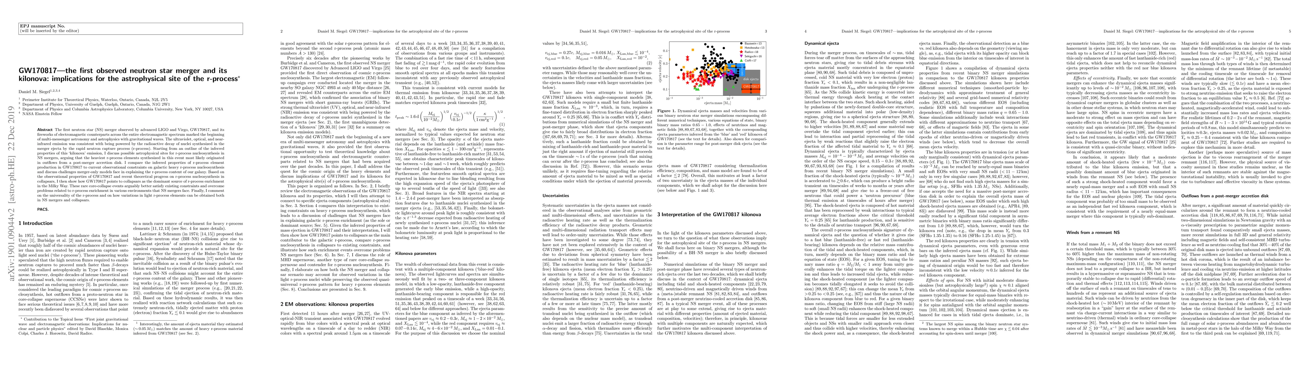 GW170817, the first neutron star merger observed, provided insights into the r-process nucleosynthesis, suggesting that the heaviest r-process elements likely originate from post-merger accretion disk outflows. This event supports the idea that core-collapse supernovae, rather than neutron star mergers, are the primary sources of r-process enrichment in the Milky Way.