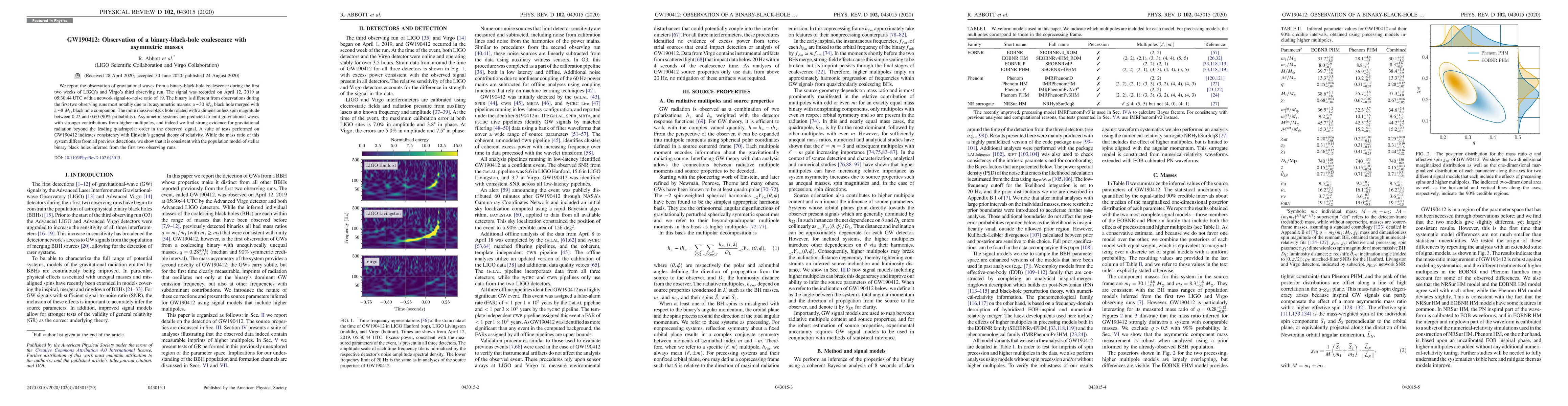 We report the observation of gravitational waves from a binary-black-hole coalescence during the first two weeks of LIGO's and Virgo's third observing run. The signal was recorded on April 12, 2019 at 05:30:44 UTC with a network signal-to-noise ratio of 19. The binary is different from observations during the first two observing runs most notably due to its asymmetric masses: a ~30 solar mass black hole merged with a ~8 solar mass black hole companion. The more massive black hole rotated with a dimensionless spin magnitude between 0.22 and 0.60 (90% probability). Asymmetric systems are predicted to emit gravitational waves with stronger contributions from higher multipoles, and indeed we find strong evidence for gravitational radiation beyond the leading quadrupolar order in the observed signal. A suite of tests performed on GW190412 indicates consistency with Einstein's general theory of relativity. While the mass ratio of this system differs from all previous detections, we show that it is consistent with the population model of stellar binary black holes inferred from the first two observing runs.
