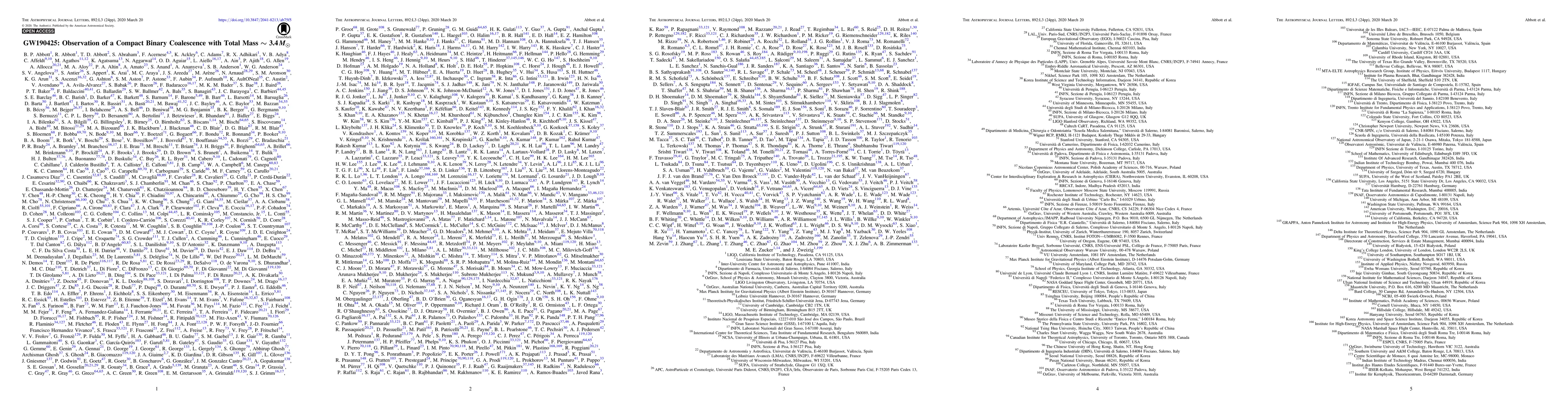GW190425, detected by LIGO Livingston, marks a compact binary coalescence with total mass around 3.4 solar masses, significantly larger than typical binary neutron star systems. The detection raises questions about the nature of the components, potentially including black holes, and updates the local neutron star merger rate.