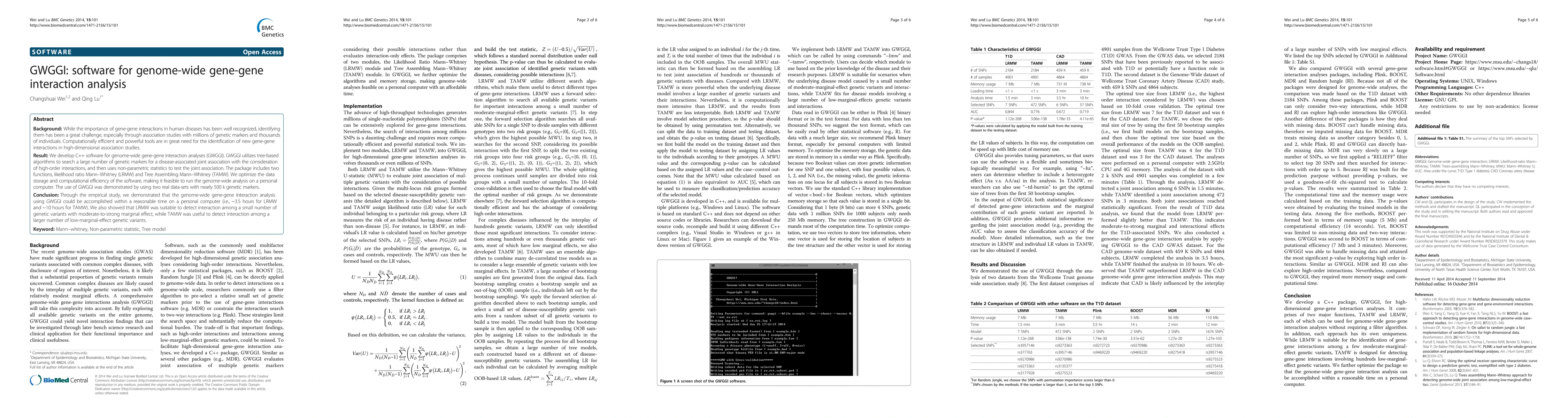 The paper introduces GWGGI, a C++ software for efficient genome-wide gene-gene interaction analysis using tree-based algorithms and non-parametric statistics. The software demonstrates feasibility for personal computer-based genome-wide analysis, successfully identifying interactions in datasets with nearly 500k genetic markers.