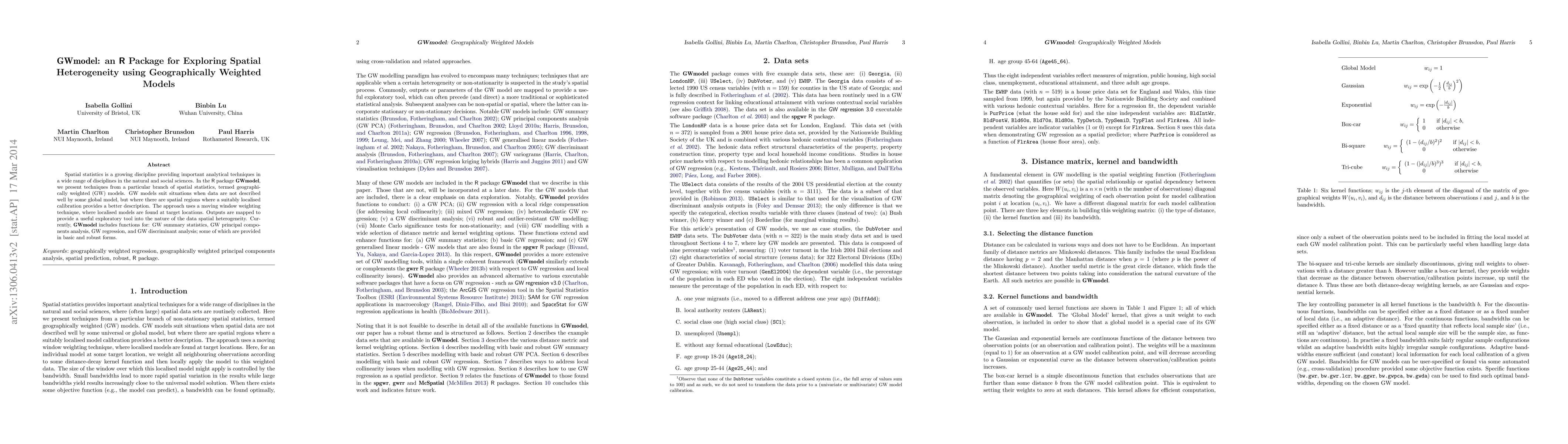 The GWmodel R package offers tools for geographically weighted models to explore spatial heterogeneity, employing localized calibrations for better data description in regions where global models fall short. It includes various techniques like GW summary statistics, principal components analysis, and regression, with outputs mapped to visualize spatial data patterns.