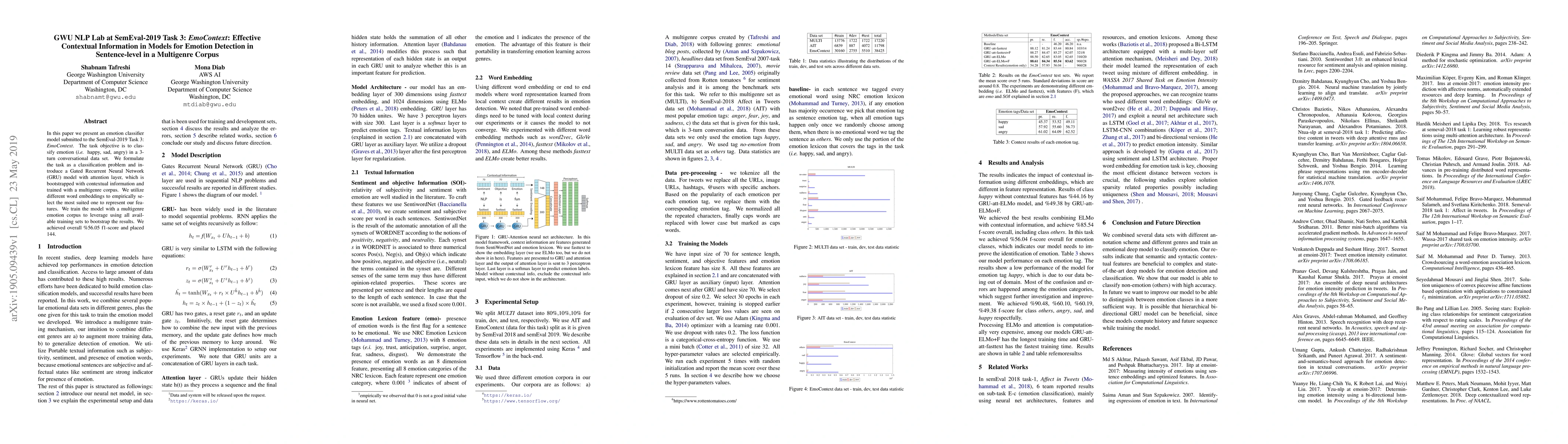 The GWU NLP Lab developed a GRU model with an attention layer for classifying emotions in a 3-turn conversational dataset from SemEval-2019 Task 3: EmoContext. The model, trained on a multigenre corpus, achieved a 56.05% F1-score, placing 144th.