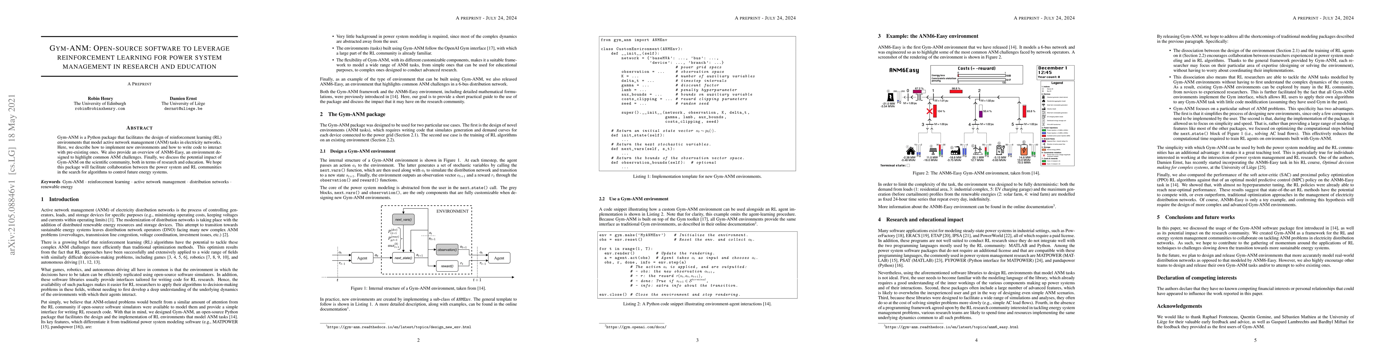 Gym-ANM is a Python package designed to create reinforcement learning environments for active network management in electricity networks, promoting collaboration between power systems and reinforcement learning research. It includes an example environment, ANM6-Easy, to illustrate common challenges and aims to enhance both research and education.