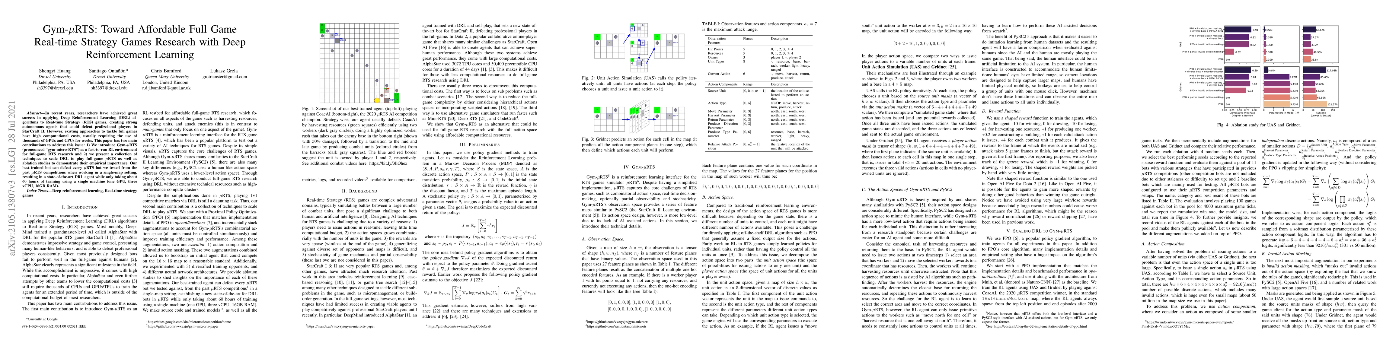 This paper introduces Gym-$\mu$RTS, a fast-to-run RL environment for affordable full-game RTS research, and presents techniques to scale Deep Reinforcement Learning to play full-game $\mu$RTS. The authors' best-trained bot outperforms past $\mu$RTS competition bots using a single machine in about 60 hours of training.
