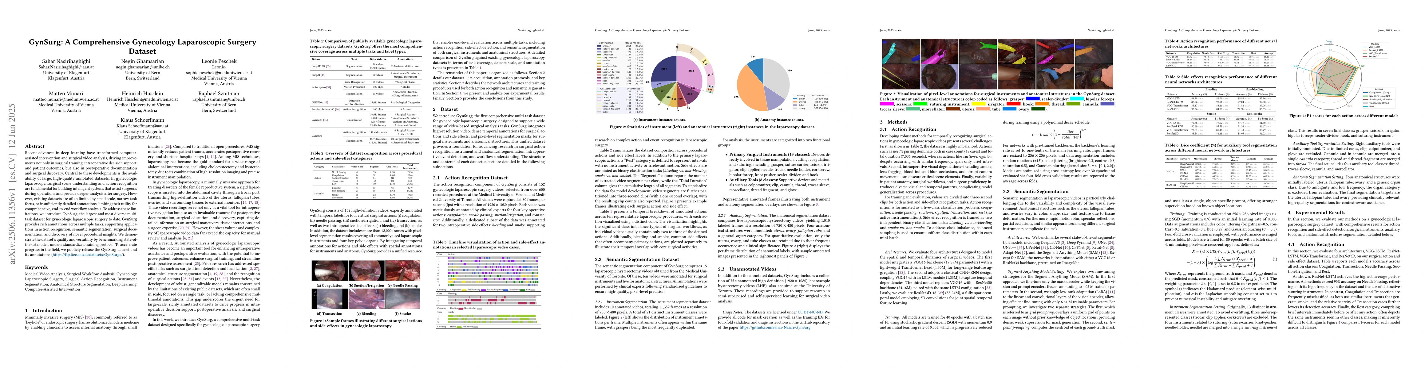 Recent advances in deep learning have transformed computer-assisted intervention and surgical video analysis, driving improvements not only in surgical training, intraoperative decision support, and patient outcomes, but also in postoperative documentation and surgical discovery. Central to these developments is the availability of large, high-quality annotated datasets. In gynecologic laparoscopy, surgical scene understanding and action recognition are fundamental for building intelligent systems that assist surgeons during operations and provide deeper analysis after surgery. However, existing datasets are often limited by small scale, narrow task focus, or insufficiently detailed annotations, limiting their utility for comprehensive, end-to-end workflow analysis. To address these limitations, we introduce GynSurg, the largest and most diverse multi-task dataset for gynecologic laparoscopic surgery to date. GynSurg provides rich annotations across multiple tasks, supporting applications in action recognition, semantic segmentation, surgical documentation, and discovery of novel procedural insights. We demonstrate the dataset quality and versatility by benchmarking state-of-the-art models under a standardized training protocol. To accelerate progress in the field, we publicly release the GynSurg dataset and its annotations