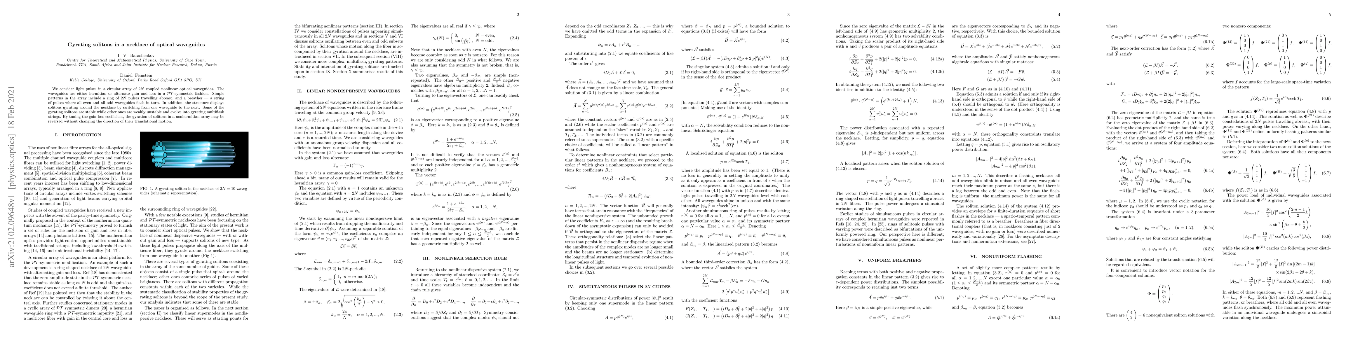 We consider light pulses in a circular array of $2N$ coupled nonlinear optical waveguides. The waveguides are either hermitian or alternate gain and loss in a $\mathcal{PT}$-symmetric fashion. Simple patterns in the array include a ring of $2N$ pulses travelling abreast, and a breather -- a string of pulses where all even and all odd waveguides flash in turn. In addition, the structure displays solitons gyrating around the necklace by switching from one waveguide to the next. Some of the gyrating solitons are stable while other ones are weakly unstable and evolve into gyrating multiflash strings. By tuning the gain-loss coefficient, the gyration of solitons in a nonhermitian array may be reversed without changing the direction of their translational motion.