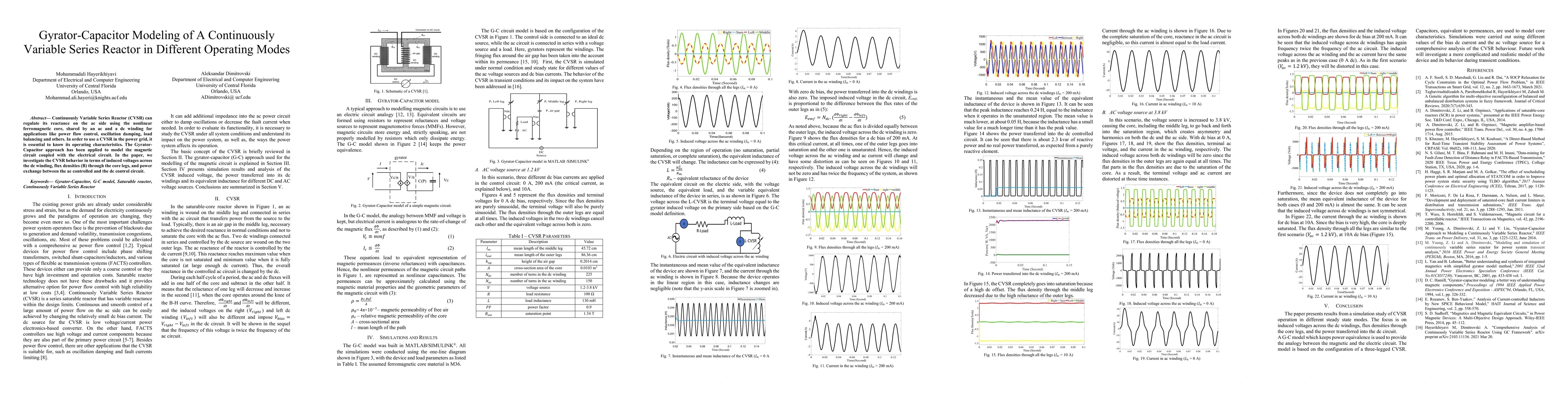 This paper models a Continuously Variable Series Reactor (CVSR) using a Gyrator-Capacitor approach, focusing on its operating characteristics in various modes, including voltages across the dc winding, core flux densities, and power exchange between ac and dc circuits. The study aims to understand the CVSR's role in power flow control and other applications.