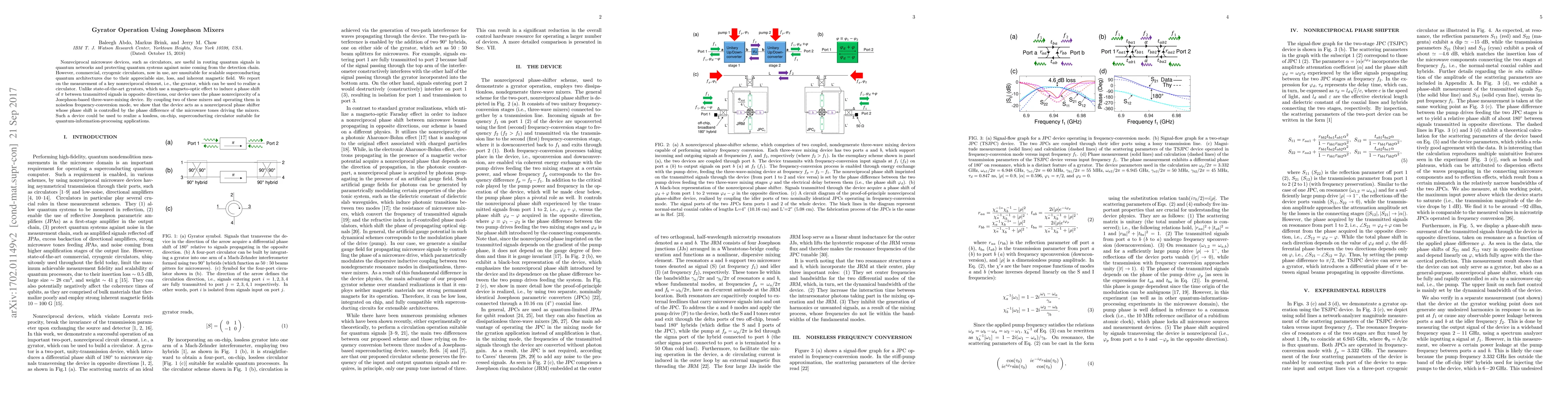 Nonreciprocal microwave devices, such as circulators, are useful in routing quantum signals in quantum networks and protecting quantum systems against noise coming from the detection chain. However, commercial, cryogenic circulators, now in use, are unsuitable for scalable superconducting quantum architectures due to their appreciable size, loss, and inherent magnetic field. We report on the measurement of a key nonreciprocal element, i.e., the gyrator, which can be used to realize a circulator. Unlike state-of-the-art gyrators, which use a magneto-optic effect to induce a phase shift of $\pi$ between transmitted signals in opposite directions, our device uses the phase nonreciprocity of a Josephson-based three-wave-mixing device. By coupling two of these mixers and operating them in noiseless frequency-conversion mode, we show that the device acts as a nonreciprocal phase shifter whose phase shift is controlled by the phase difference of the microwave tones driving the mixers. Such a device could be used to realize a lossless, on-chip, superconducting circulator suitable for quantum-information-processing applications.