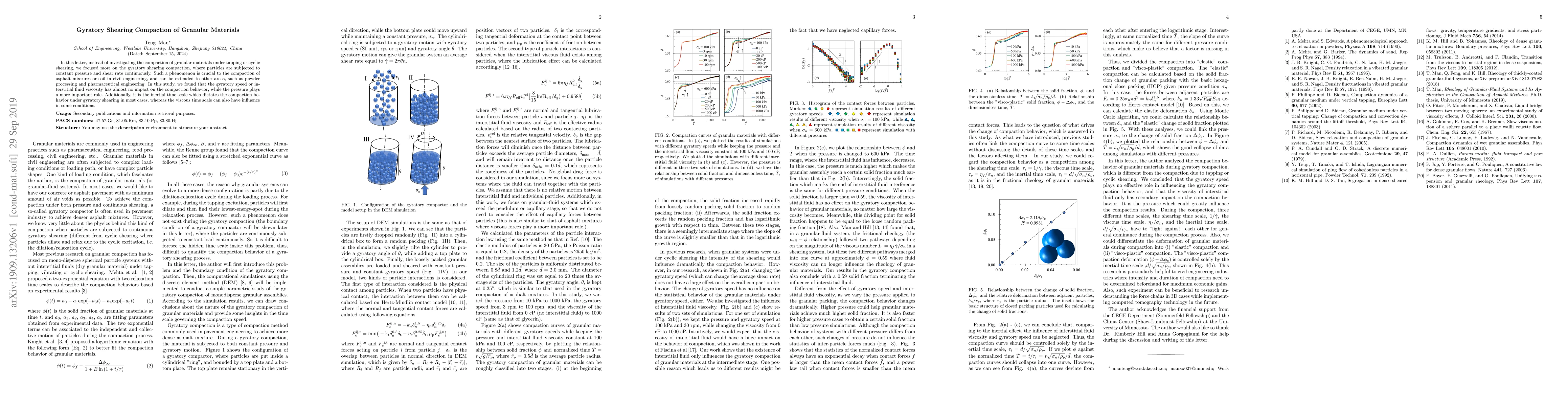 This paper investigates gyratory shearing compaction of granular materials under constant pressure and shear rate, focusing on its relevance to asphalt mixtures and soil in civil engineering. The study finds that pressure is a crucial factor in compaction, while gyratory speed and fluid viscosity have minimal impact, with inertial time scale predominantly dictating compaction behavior.