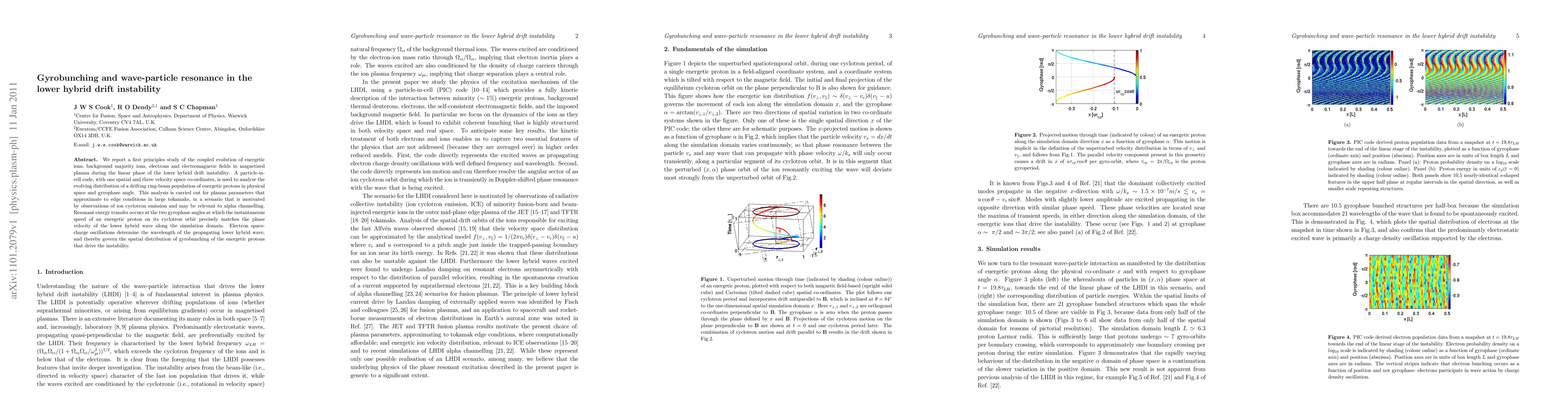 We report a first principles study of the coupled evolution of energetic ions, background majority ions, electrons and electromagnetic fields in magnetised plasma during the linear phase of the lower hybrid drift instability. A particle-in-cell code, with one spatial and three velocity space co-ordinates, is used to analyse the evolving distribution of a drifting ring-beam population of energetic protons in physical space and gyrophase angle. This analysis is carried out for plasma parameters that approximate to edge conditions in large tokamaks, in a scenario that is motivated by observations of ion cyclotron emission and may be relevant to alpha channelling. Resonant energy transfer occurs at the two gyrophase angles at which the instantaneous speed of an energetic proton on its cyclotron orbit precisely matches the phase velocity of the lower hybrid wave along the simulation domain. Electron space-charge oscillations determine the wavelength of the propagating lower hybrid wave, and thereby govern the spatial distribution of gyrobunching of the energetic protons that drive the instability.