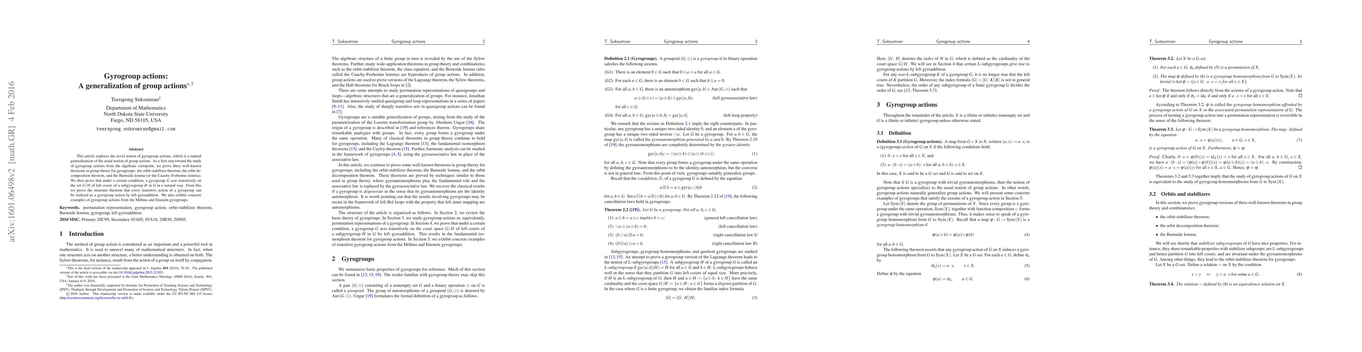 This paper generalizes group actions to gyrogroup actions, proving key group theory theorems for gyrogroups and demonstrating that gyrogroups can act transitively on cosets. It concludes with examples from Möbius and Einstein gyrogroups.