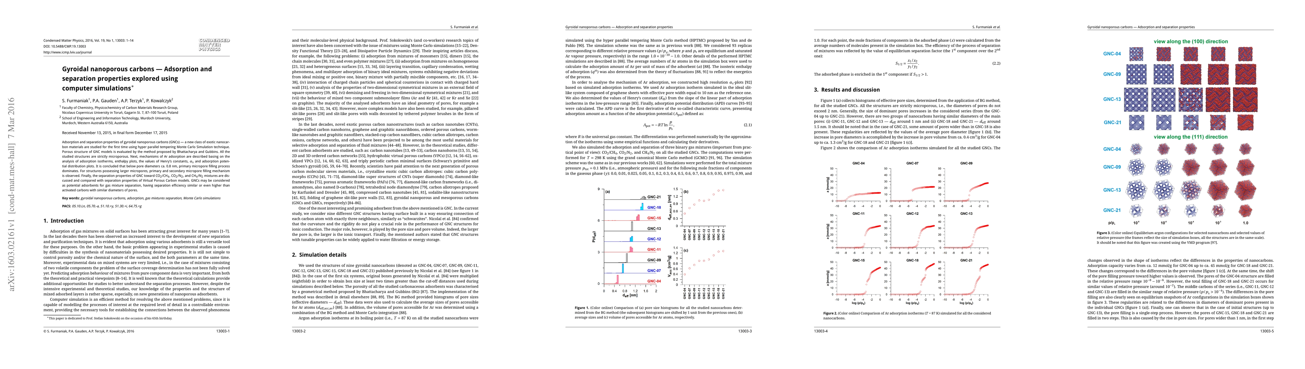 Researchers used computer simulations to study gyroidal nanoporous carbons, finding they have high separation efficiency for gas mixtures similar to activated carbons, with potential applications in adsorption technology.