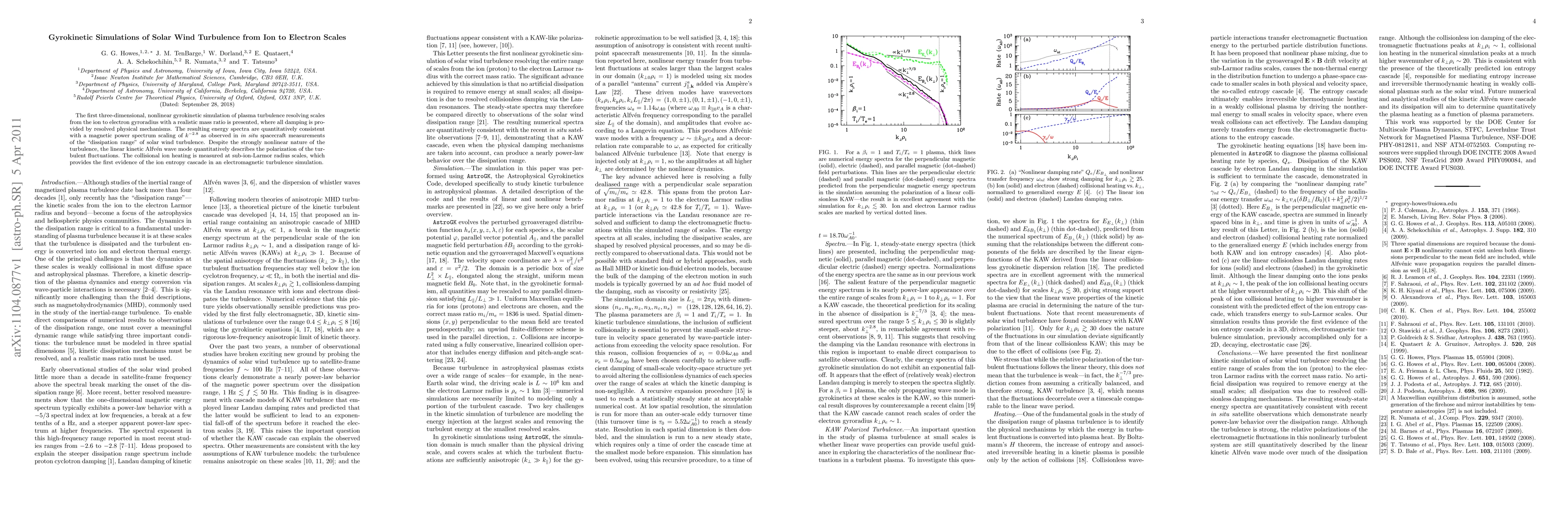 This paper presents the first three-dimensional, nonlinear gyrokinetic simulation of solar wind turbulence, resolving scales from ion to electron gyroradii, and shows energy spectra consistent with observed $k^{-2.8}$ magnetic power scaling. The linear kinetic Alfven wave mode accurately describes the polarization of turbulent fluctuations.