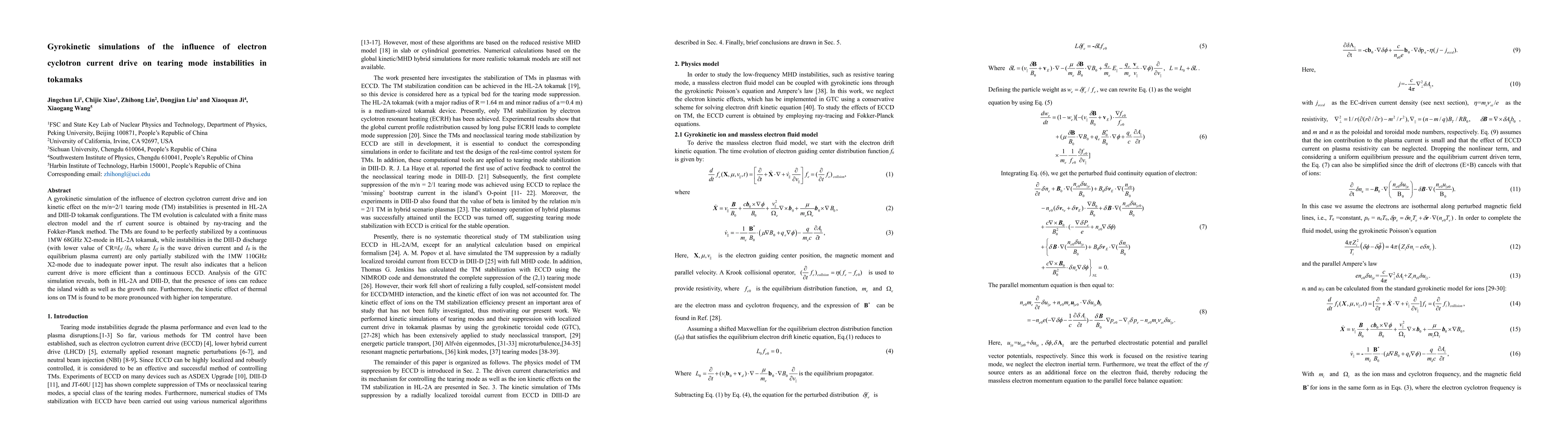 This paper uses gyrokinetic simulations to study the stabilization of m/n=2/1 tearing mode instabilities in tokamaks via electron cyclotron current drive. The simulations show complete stabilization in HL-2A with a 1MW 68GHz X2-mode, while partial stabilization in DIII-D with lower power input, indicating the efficiency of helicon current drive and the role of ion kinetic effects in reducing island width and growth rate.