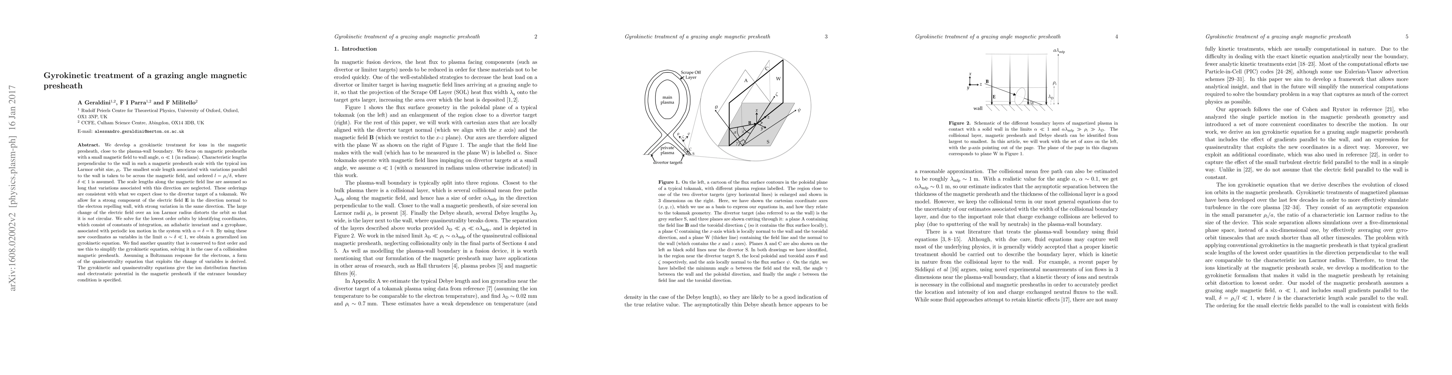 We develop a gyrokinetic treatment for ions in the magnetic presheath, close to the plasma-wall boundary. We focus on magnetic presheaths with a small magnetic field to wall angle, $\alpha \ll 1$ (in radians). Characteristic lengths perpendicular to the wall in such a magnetic presheath scale with the typical ion Larmor orbit size, $\rho_{\text{i}}$. The smallest scale length associated with variations parallel to the wall is taken to be across the magnetic field, and ordered $l = \rho_{\text{i}} / \delta$, where $ \delta \ll 1$ is assumed. The scale lengths along the magnetic field line are assumed so long that variations associated with this direction are neglected. These orderings are consistent with what we expect close to the divertor target of a tokamak. We allow for a strong component of the electric field $\vec{E}$ in the direction normal to the electron repelling wall, with strong variation in the same direction. The large change of the electric field over an ion Larmor radius distorts the orbit so that it is not circular. We solve for the lowest order orbits by identifying coordinates, which consist of constants of integration, an adiabatic invariant and a gyrophase, associated with periodic ion motion in the system with $\alpha = \delta = 0$. By using these new coordinates as variables in the limit $\alpha \sim \delta \ll 1$, we obtain a generalized ion gyrokinetic equation. We find another quantity that is conserved to first order and use this to simplify the gyrokinetic equation, solving it in the case of a collisionless magnetic presheath. Assuming a Boltzmann response for the electrons, a form of the quasineutrality equation that exploits the change of variables is derived. The gyrokinetic and quasineutrality equations give the ion distribution function and electrostatic potential in the magnetic presheath if the entrance boundary condition is specified.