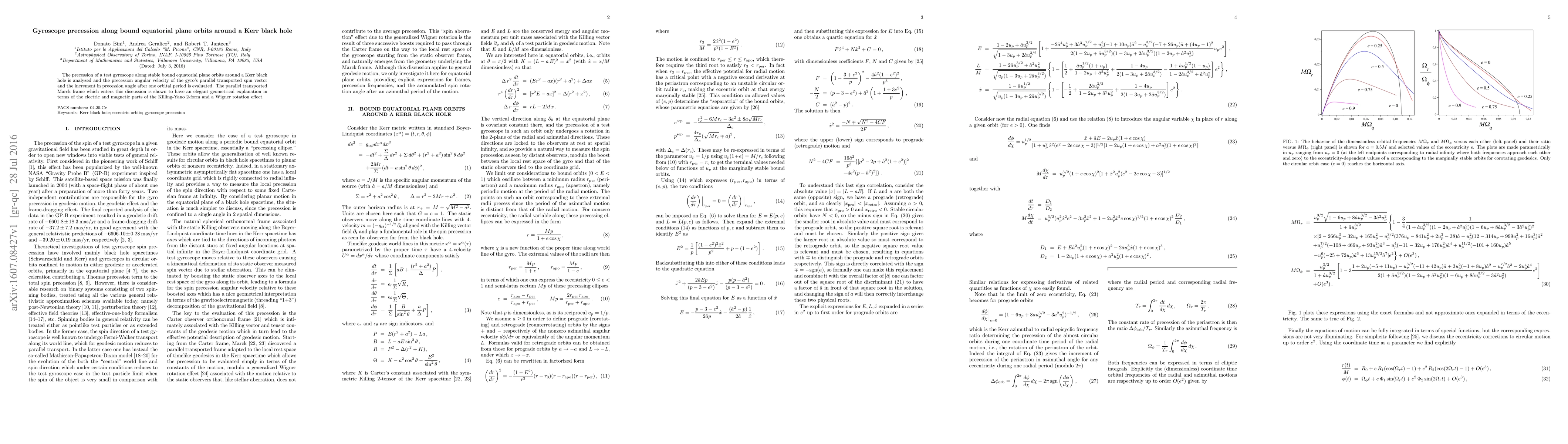The precession of a test gyroscope along stable bound equatorial plane orbits around a Kerr black hole is analyzed and the precession angular velocity of the gyro's parallel transported spin vector and the increment in precession angle after one orbital period is evaluated. The parallel transported Marck frame which enters this discussion is shown to have an elegant geometrical explanation in terms of the electric and magnetic parts of the Killing-Yano 2-form and a Wigner rotation effect.