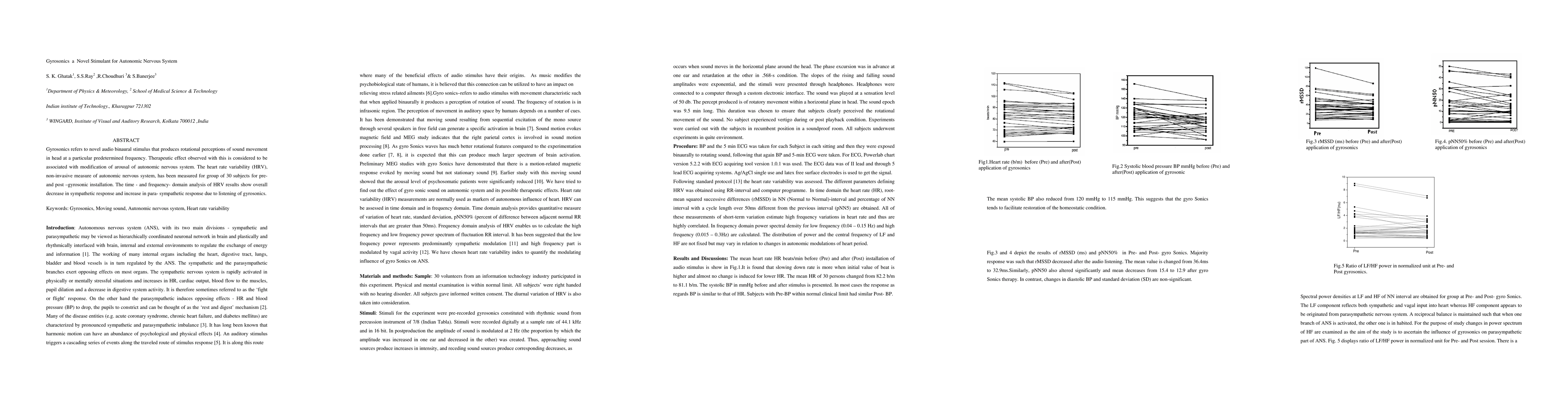 Gyrosonics refers to novel audio binaural stimulus that produces rotational perceptions of sound movement in head at a particular predetermined frequency. Therapeutic effect observed with this is considered to be associated with modification of arousal of autonomic nervous system. The heart rate variability (HRV), non-invasive measure of autonomic nervous system, has been measured for group of 30 subjects for pre- and post- gyrosonic installation. The time- and frequency- domain analysis of HRV results show overall decrease in sympathetic response and increase in para- sympathetic response due to listening of gyro sonics.