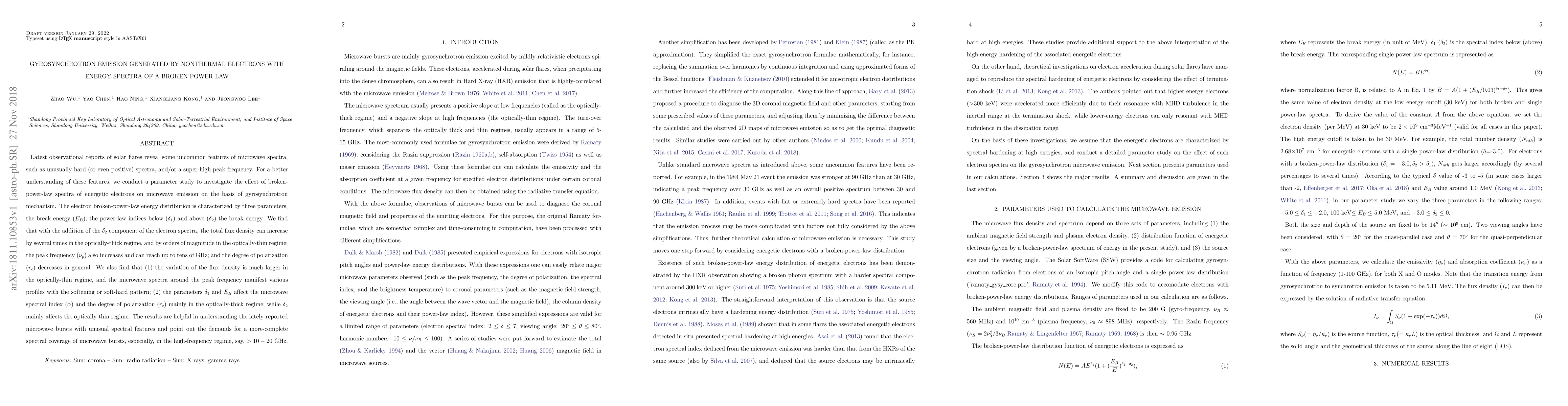 This study explores how broken-power-law energy distributions of nonthermal electrons impact solar flare microwave emissions via gyrosynchrotron mechanism. Key findings include significant flux density increases, peak frequency enhancements up to tens of GHz, and polarization degree reductions. The research highlights that parameters $delta_1$ and $E_B$ influence spectral index and polarization mainly in the optically-thick regime, while $delta_2$ impacts the optically-thin regime. The study emphasizes the need for comprehensive microwave burst spectral coverage, especially above 10-20 GHz, to understand unusual spectral features observed in recent solar flare reports.