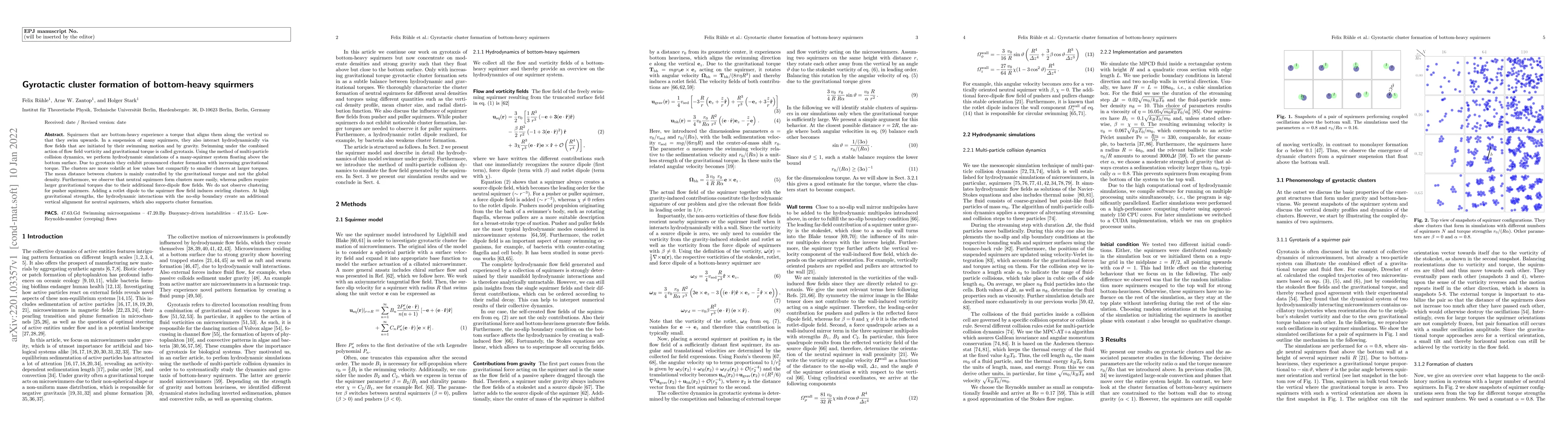 Research reveals that bottom-heavy squirmers form clusters in response to gravitational torque, with neutral squirmers forming easily and pullers requiring stronger torques, while pusher squirmers do not cluster.
