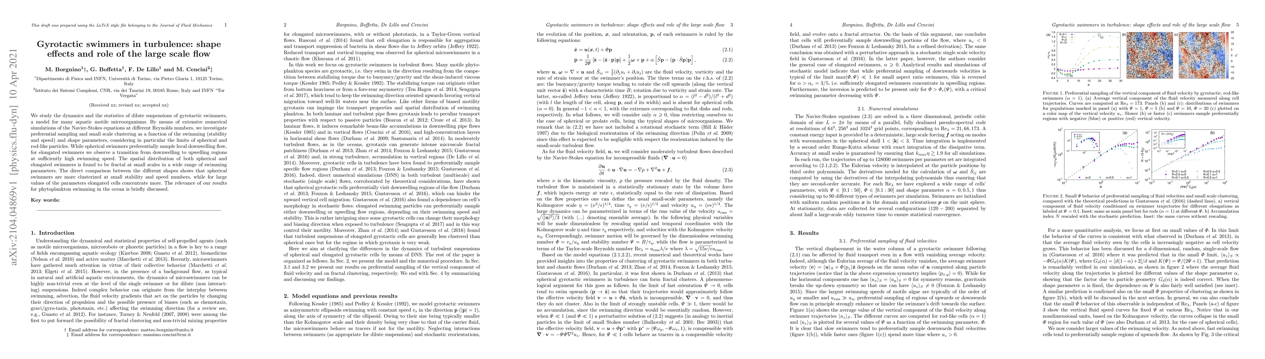 This paper investigates the dynamics of gyrotactic swimmers in turbulent flow through numerical simulations, focusing on the effects of shape and swimming parameters. It finds that spherical swimmers cluster in downwelling regions, while elongated swimmers transition to upwelling regions with higher swimming speeds, highlighting the fractal nature of their spatial distribution.