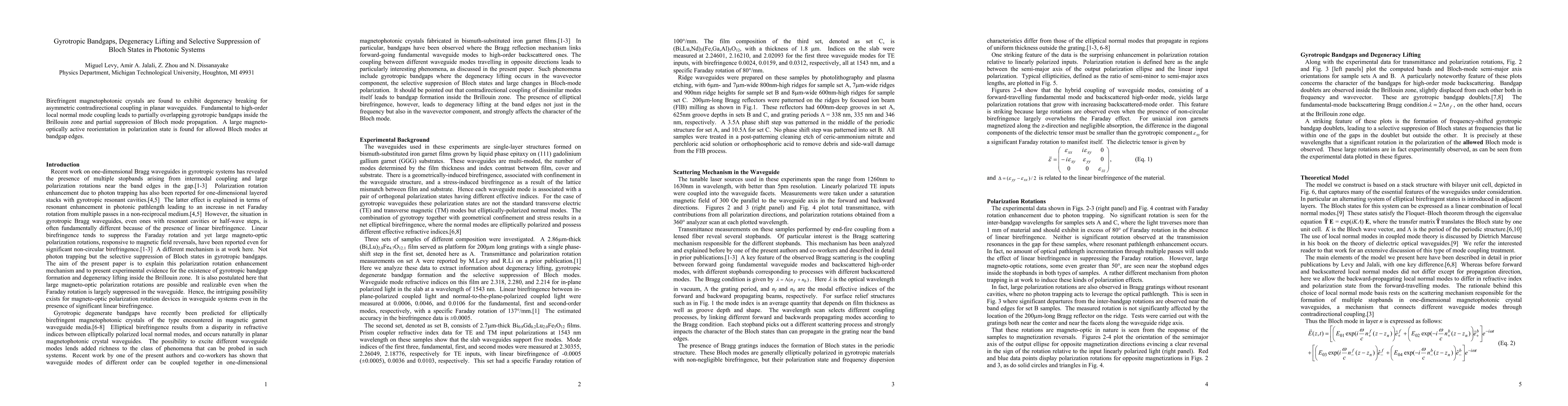 This paper explores birefringent magnetophotonic crystals that break degeneracy through asymmetric contradirectional coupling in planar waveguides, resulting in partially overlapping gyrotropic bandgaps and selective suppression of Bloch modes, with significant magneto-optical polarization state reorientation at bandgap edges.