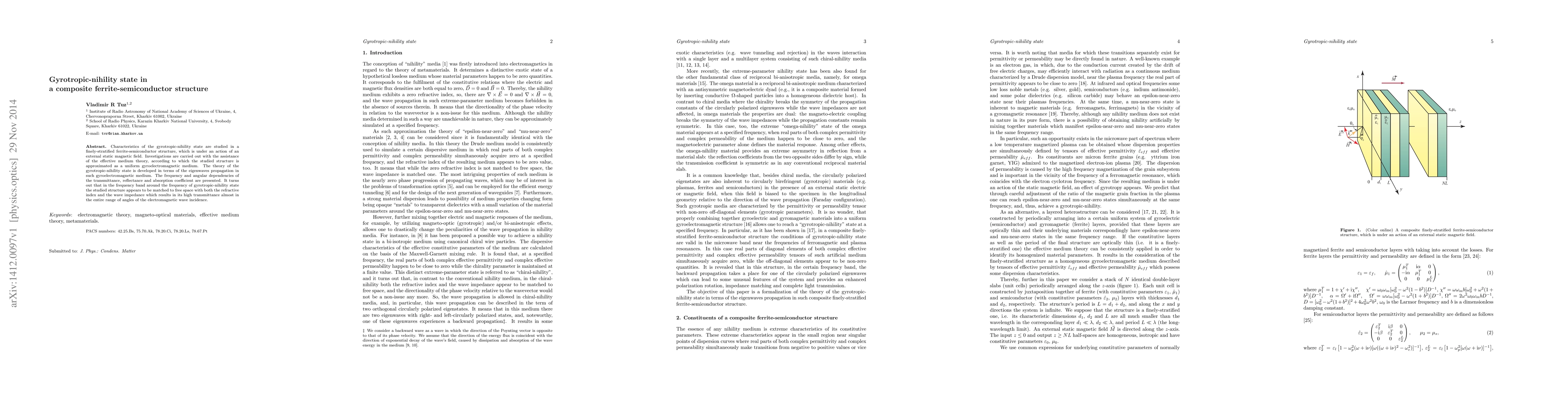 This paper investigates the gyrotropic-nihility state in a stratified ferrite-semiconductor structure under a static magnetic field, using effective medium theory to model its behavior. The study reveals high transmittance across a frequency band due to the structure's matching to free space in terms of refractive index and wave impedance.