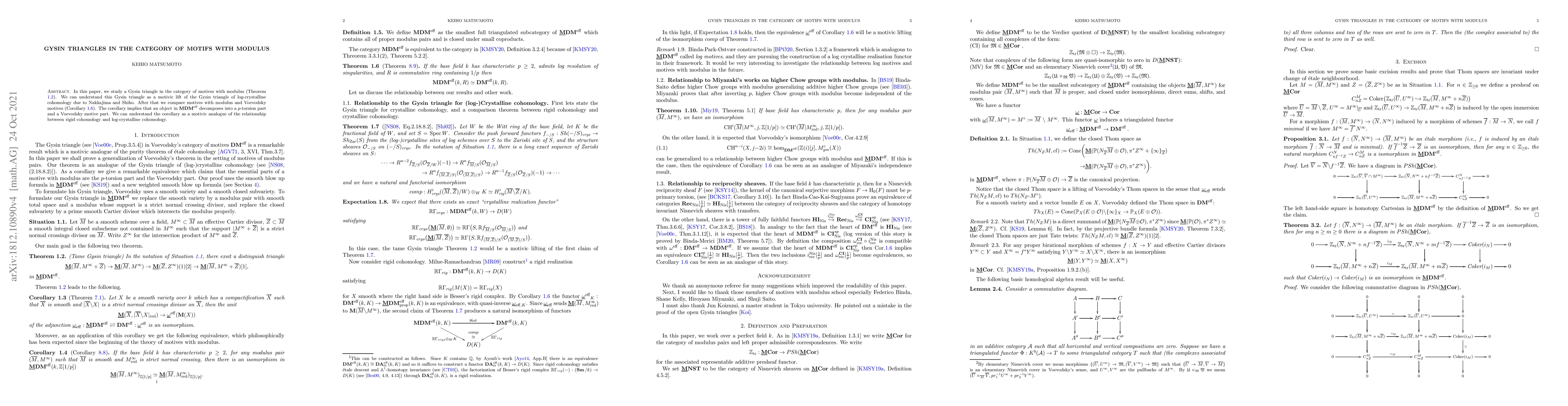 This paper explores Gysin triangles in the category of motives with modulus, providing a motivic lift of Nakajima and Shiho's log-crystalline cohomology Gysin triangle. It also compares motives with modulus to Voevodsky motives, concluding that objects in this category decompose into $p$-torsion and Voevodsky motive parts, mirroring the relationship between rigid and log-crystalline cohomologies.