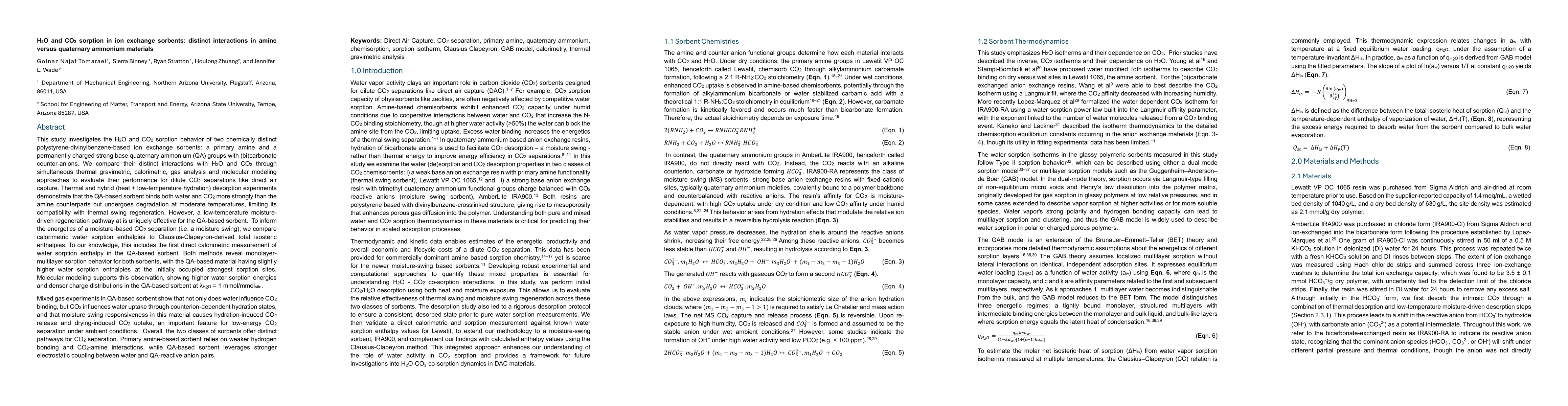 This study investigates the H$_2$O and CO$_2$ sorption behavior of two ion exchange sorbents: a primary amine and a permanently charged strong base quaternary ammonium (QA) groups with (bi)carbonate counter-anions. We compare their distinct interactions with H$_2$O and CO$_2$ through simultaneous thermal gravimetric, calorimetric, gas analysis and molecular modeling to evaluate their performance for dilute CO$_2$ separations like direct air capture. Thermal and hybrid (heat + low-temperature hydration) desorption experiments demonstrate that the QA-based sorbent binds both water and CO$_2$ more strongly than the amine counterparts but undergoes degradation at moderate temperatures, limiting its compatibility with thermal swing regeneration. However, a low-temperature moisture-driven regeneration pathway at is uniquely effective for the QA-based sorbent. To inform the energetics of a moisture-based CO$_2$ separation, we compare calorimetric water sorption enthalpies to isosteric enthalpies. To our knowledge, this includes the first direct measurement of water sorption enthalpy in the QA-based sorbent. Molecular modeling supports this observation, showing higher water sorption energies and denser charge distributions in the QA-based sorbent. Mixed gas experiments in QA-based sorbent show that not only does water influence CO$_2$ binding, but CO$_2$ influences water uptake through counterion-dependent hydration states, and that moisture swing responsiveness in this material causes hydration-induced CO$_2$ release and drying-induced CO$_2$ uptake, an important feature for low-energy CO$_2$ separation under ambient conditions. Overall, the two classes of sorbents offer distinct pathways for CO$_2$ separation. Primary amine-based sorbent relies on weaker hydrogen bonding and CO$_2$-amine interactions, while QA-based sorbent leverages stronger electrostatic coupling between water and QA-reactive anion pairs.