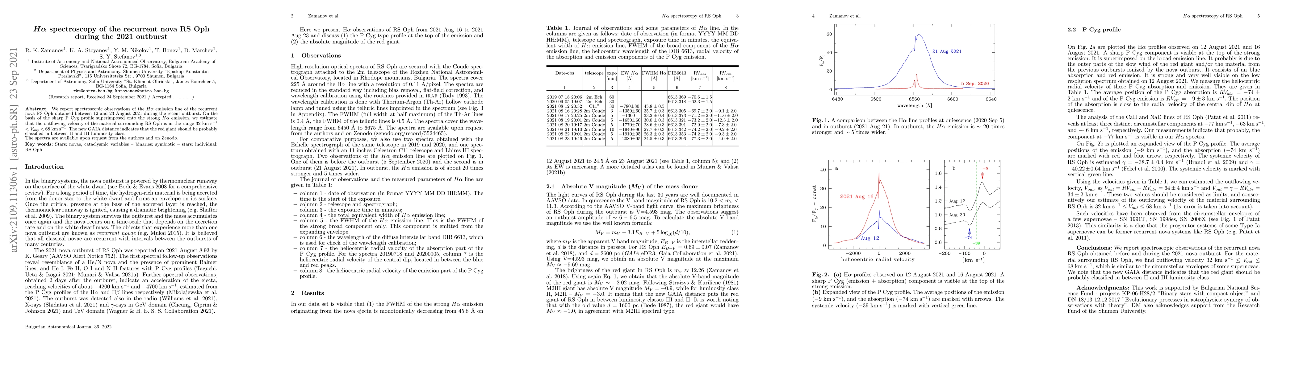 This paper reports on $H\alpha$ spectroscopic observations of the recurrent nova RS Oph during its 2021 outburst, revealing outflowing material velocities between 32 km/s and 68 km/s. The study also suggests a revised luminosity classification for the red giant component based on new GAIA distance measurements.