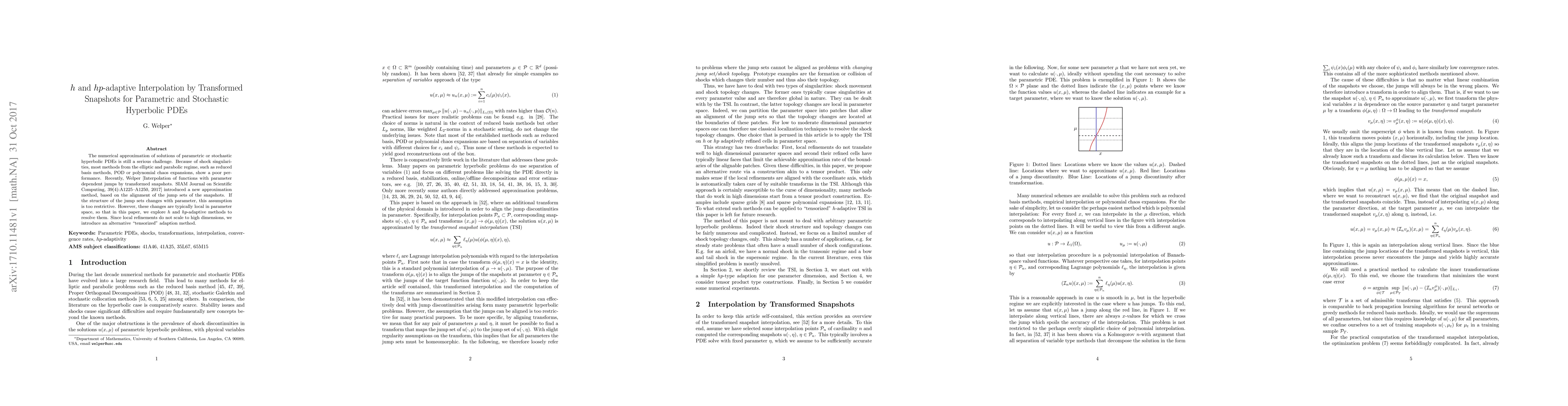 The numerical approximation of solutions of parametric or stochastic hyperbolic PDEs is still a serious challenge. Because of shock singularities, most methods from the elliptic and parabolic regime, such as reduced basis methods, POD or polynomial chaos expansions, show a poor performance. Recently, Welper [Interpolation of functions with parameter dependent jumps by transformed snapshots. SIAM Journal on Scientific Computing, 39(4):A1225-A1250, 2017] introduced a new approximation method, based on the alignment of the jump sets of the snapshots. If the structure of the jump sets changes with parameter, this assumption is too restrictive. However, these changes are typically local in parameter space, so that in this paper, we explore $h$ and $hp$-adaptive methods to resolve them. Since local refinements do not scale to high dimensions, we introduce an alternative "tensorized" adaption method.