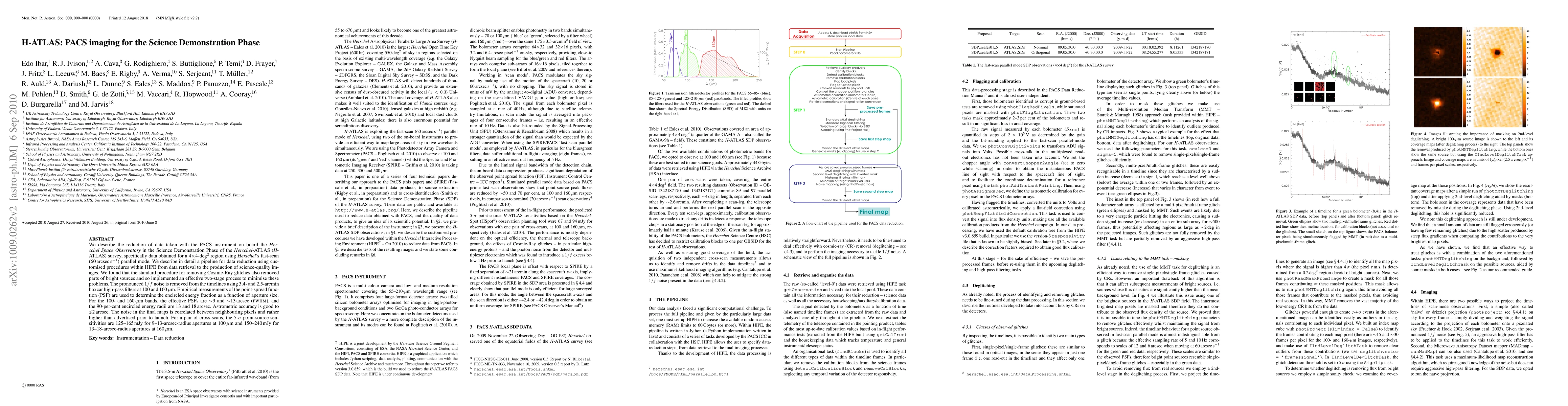 This paper details the data reduction process for PACS imaging from the Herschel Space Observatory during the Science Demonstration Phase of the H-ATLAS survey. The study implements a two-stage method to mitigate Cosmic-Ray glitches and employs high-pass filters to reduce 1/f noise, achieving effective PSFs of ~9 and ~13 arcsec at 100 and 160 um, respectively.