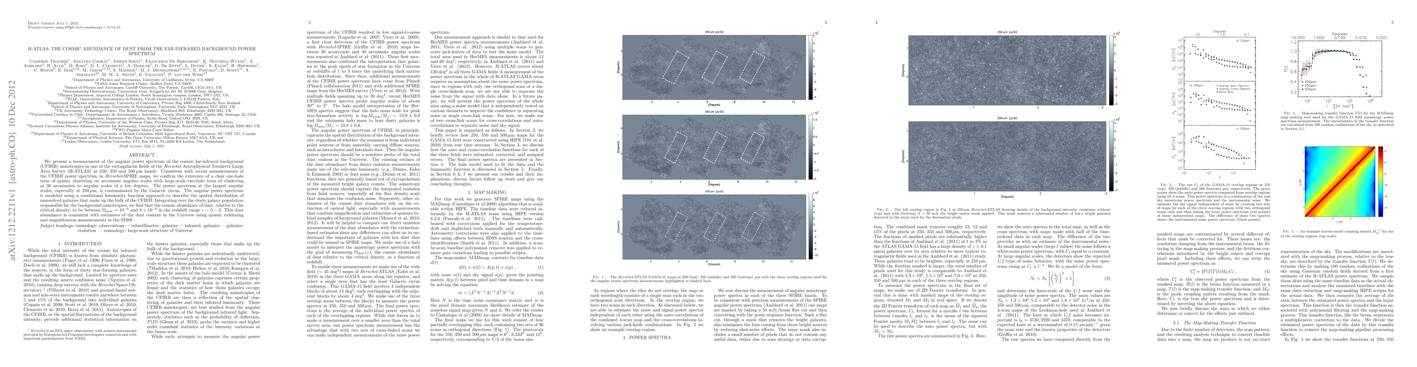 We present a measurement of the angular power spectrum of the cosmic far-infrared background (CFIRB) anisotropies in one of the extragalactic fields of the Herschel Astrophysical Terahertz Large Area Survey (H-ATLAS) at 250, 350 and 500 \mu m bands. Consistent with recent measurements of the CFIRB power spectrum in Herschel-SPIRE maps, we confirm the existence of a clear one-halo term of galaxy clustering on arcminute angular scales with large-scale two-halo term of clustering at 30 arcminutes to angular scales of a few degrees. The power spectrum at the largest angular scales, especially at 250 \mu m, is contaminated by the Galactic cirrus. The angular power spectrum is modeled using a conditional luminosity function approach to describe the spatial distribution of unresolved galaxies that make up the bulk of the CFIRB. Integrating over the dusty galaxy population responsible for the background anisotropies, we find that the cosmic abundance of dust, relative to the critical density, to be between \Omega_dust=10^{-6} and 8 x 10^{-6} in the redshift range z ~ 0-3. This dust abundance is consistent with estimates of the dust content in the Universe using quasar reddening and magnification measurements in the SDSS.
