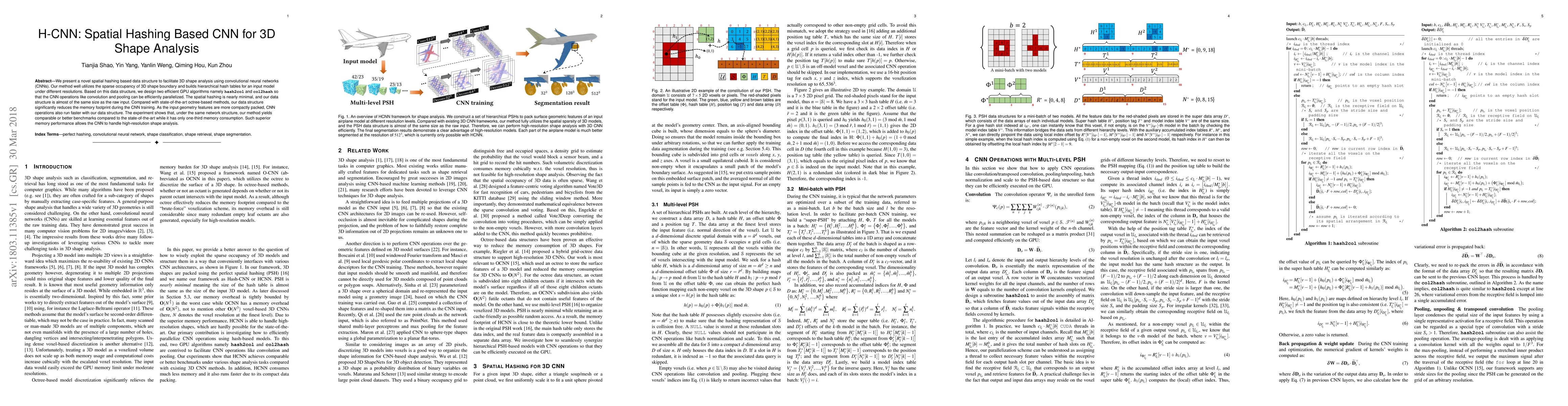 H-CNN presents a novel spatial hashing data structure and GPU-optimized algorithms for CNN operations, enabling efficient 3D shape analysis with reduced memory consumption.