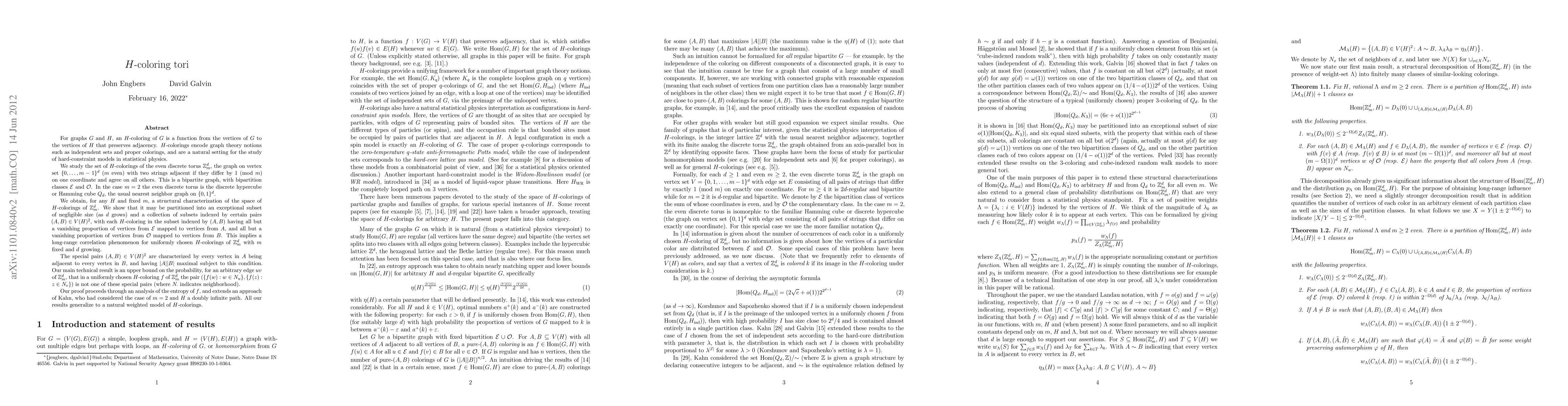 This paper studies $H$-colorings of the even discrete torus ${\mathbb Z}^d_m$, a bipartite graph on vertex set ${0, ..., m-1}^d$. It provides a structural characterization of the space of $H$-colorings, showing a partition into an exceptional set and subsets indexed by pairs $(A,B) \in V(H)^2$, revealing long-range correlation phenomena as dimension $d$ grows.