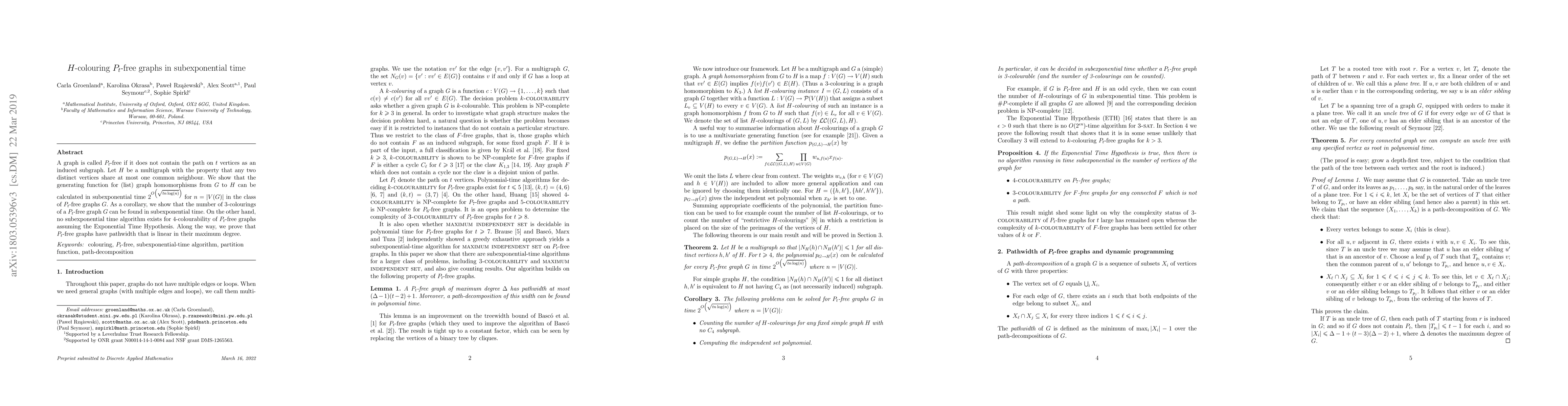 This paper demonstrates that calculating the generating function for graph homomorphisms from $P_t$-free graphs to specific $H$-multigraphs can be done in subexponential time, and as a corollary, it shows that 3-colourings of such graphs can be found similarly. However, it argues that no subexponential time algorithm exists for 4-colouring under the Exponential Time Hypothesis.