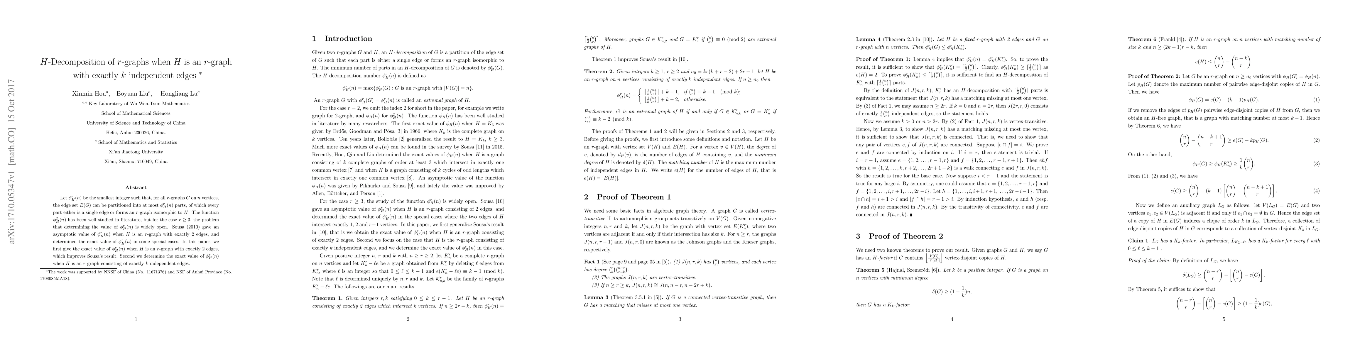 Let $\phi_H^r(n)$ be the smallest integer such that, for all $r$-graphs $G$ on $n$ vertices, the edge set $E(G)$ can be partitioned into at most $\phi_H^r(n)$ parts, of which every part either is a single edge or forms an $r$-graph isomorphic to $H$. The function $\phi^2_H(n)$ has been well studied in literature, but for the case $r\ge 3$, the problem that determining the value of $\phi_H^r(n)$ is widely open. Sousa (2010) gave an asymptotic value of $\phi_H^r(n)$ when $H$ is an $r$-graph with exactly 2 edges, and determined the exact value of $\phi_H^r(n)$ in some special cases. In this paper, we first give the exact value of $\phi_H^r(n)$ when $H$ is an $r$-graph with exactly 2 edges, which improves Sousa's result. Second we determine the exact value of $\phi_H^r(n)$ when $H$ is an $r$-graph consisting of exactly $k$ independent edges.