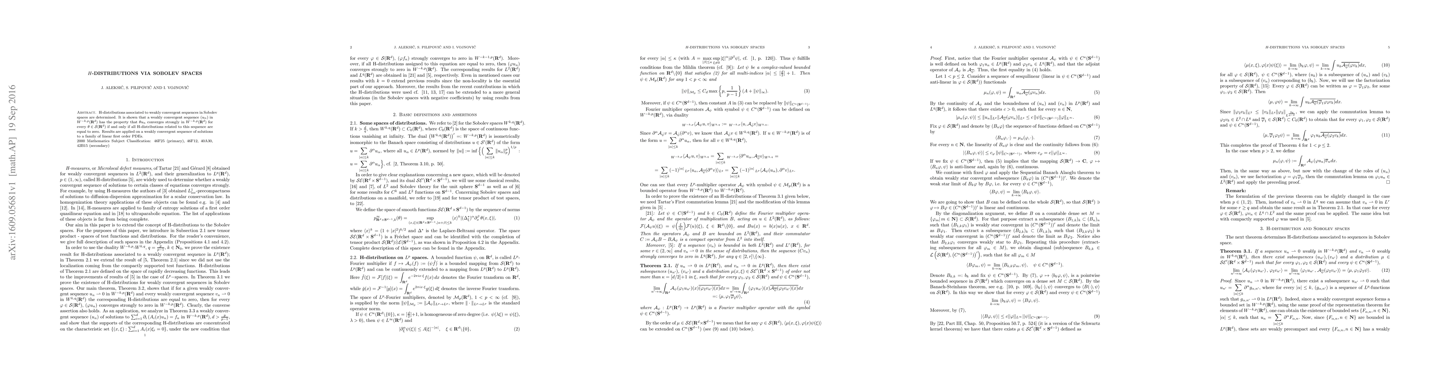 H-distributions associated to weakly convergent sequences in Sobolev spaces are determined. It is shown that a weakly convergent sequence $(u_n)$ in $W^{-k,p}( \R^d)$ has the property that $\theta u_n$ converges strongly in $W^{-k,p}(\R^d)$ for every $\theta\in\mathcal S(\R^d)$ if and only if all H-distributions related to this sequence are equal to zero. Results are applied on a weakly convergent sequence of solutions to a family of linear first order PDEs.