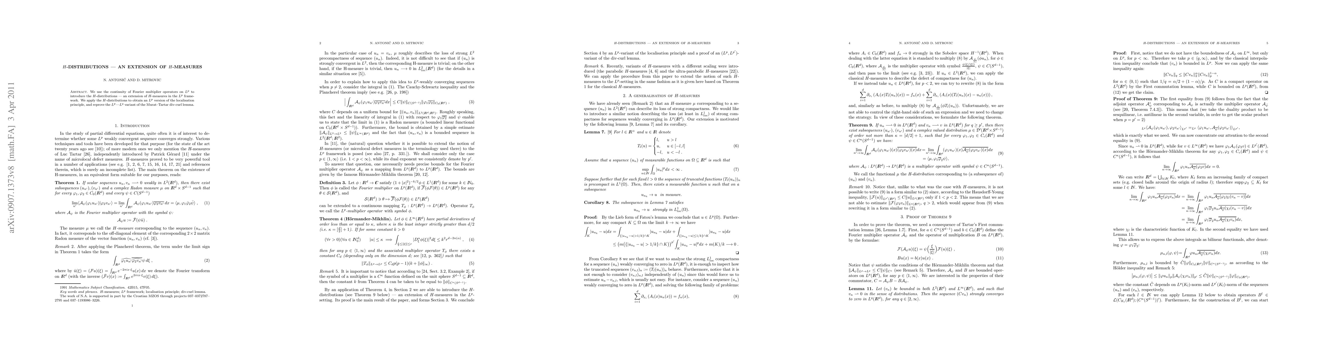 We use the continuity of Fourier multiplier operators on $L^p$ to introduce the $H$-distributions --- an extension of $H$-measures in the $L^p$ framework. We apply the $H$-distributions to obtain an $L^p$ version of the localisation principle, and reprove the $L^p$---$L^q$ variant of the Murat--Tartar div-curl lemma.