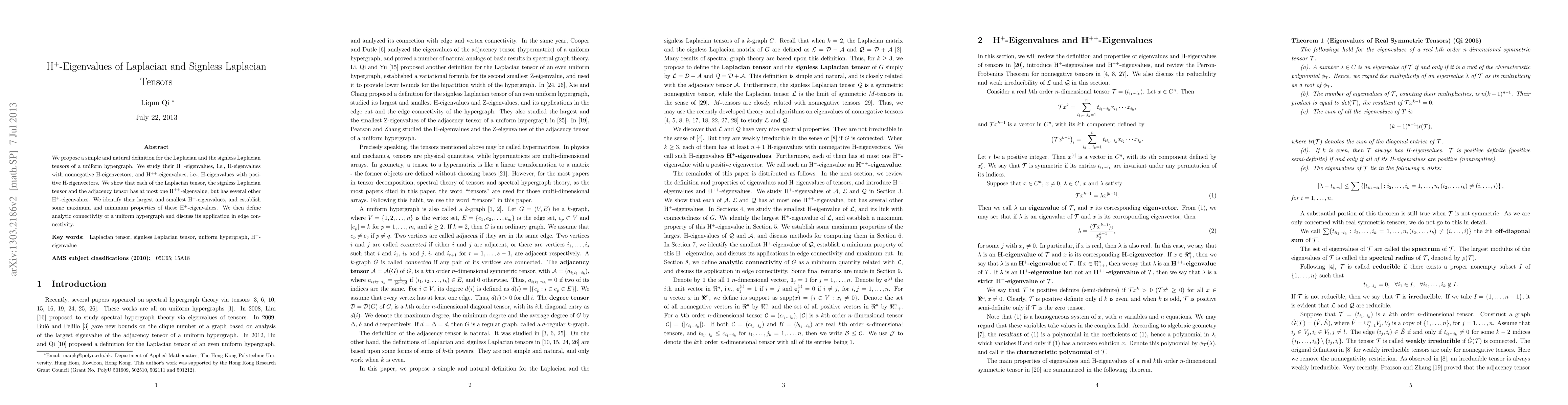 This paper introduces definitions for Laplacian and signless Laplacian tensors of uniform hypergraphs, examining their H$^+$- and H$^{++}$-eigenvalues. It proves each tensor has at most one H$^{++}$-eigenvalue but multiple H$^+$-eigenvalues, identifies their largest and smallest H$^+$-eigenvalues, and discusses applications to analytic connectivity and edge connectivity.