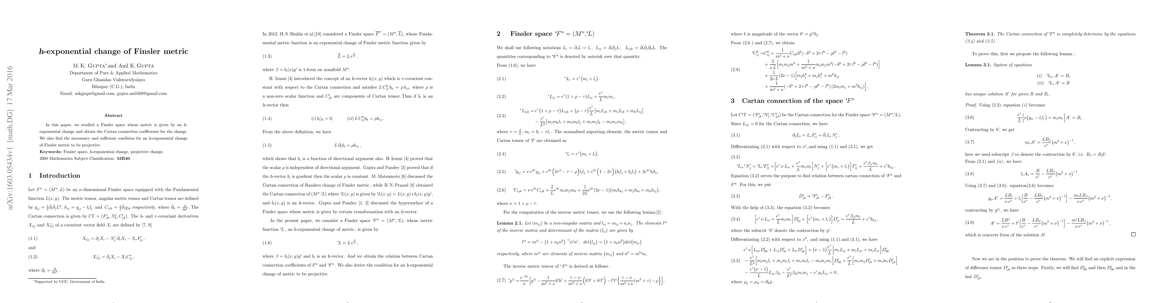 Researchers studied changes to Finsler metrics using h-exponential transformations, finding necessary conditions for these changes to be projective and calculating the related Cartan connection coefficients.