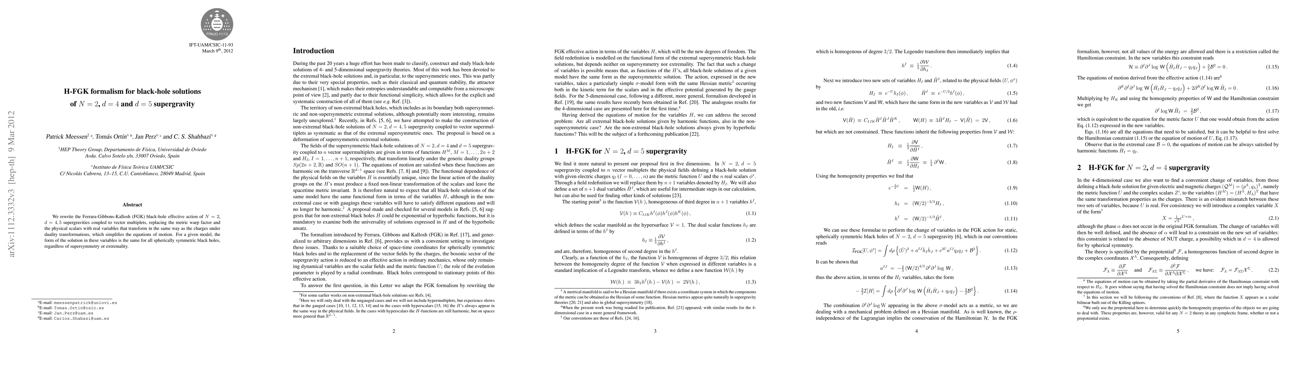 This paper reformulates the Ferrara-Gibbons-Kallosh (FGK) black-hole effective action for N=2, d=4 and d=5 supergravity, simplifying equations of motion by using real variables that align with duality transformations. The resulting formalism reveals a universal solution form for all spherically symmetric black holes, irrespective of supersymmetry or extremality.
