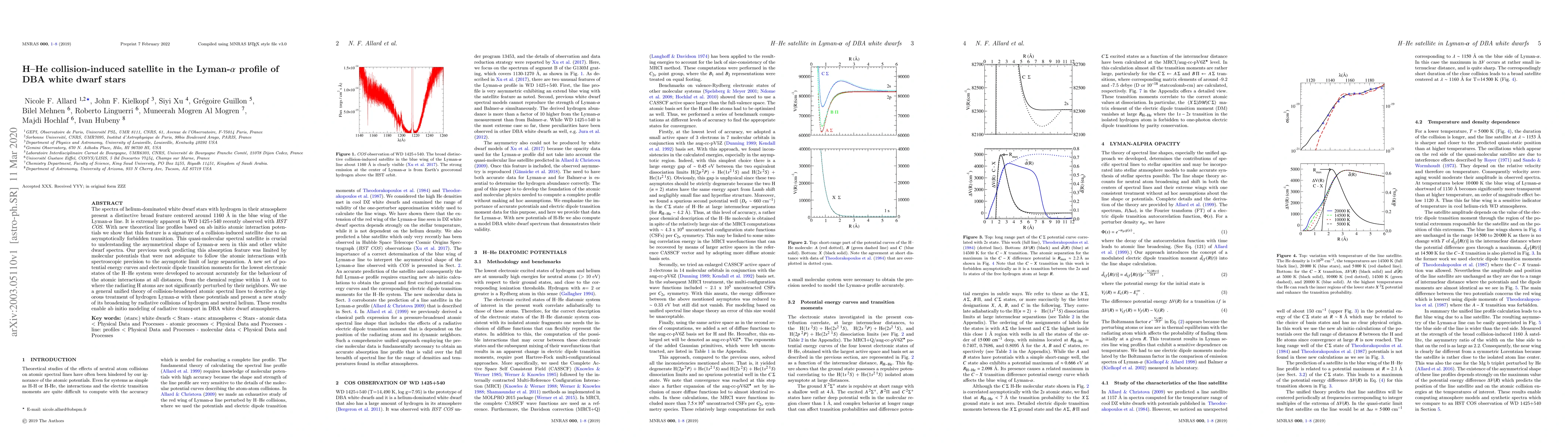 The spectra of helium-dominated white dwarf stars with hydrogen in their atmosphere present a distinctive broad feature centered around 1160~\AA\/ in the blue wing of the Lyman-$\alpha$ line. It is extremely apparent in WD 1425+540 recently observed with HST COS. With new theoretical line profiles based on ab initio atomic interaction potentials we show that this feature is a signature of a collision-induced satellite due to an asymptotically forbidden transition. This quasi-molecular spectral satellite is crucial to understanding the asymmetrical shape of Lyman-$\alpha$ seen in this and other white dwarf spectra. Our previous work predicting this absorption feature was limited by molecular potentials that were not adequate to follow the atomic interactions with spectroscopic precision to the asymptotic limit of large separation. A new set of potential energy curves and electronic dipole transition moments for the lowest electronic states of the H--He system were developed to account accurately for the behavior of the atomic interactions at all distances, from the chemical regime within 1~\AA\/ out to where the radiating H atoms are not significantly perturbed by their neighbors. We use a general unified theory of collision-broadened atomic spectral lines to describe a rigorous treatment of hydrogen Lyman-$\alpha$ with these potentials and present a new study of its broadening by radiative collisions of hydrogen and neutral helium. These results enable ab initio modeling of radiative transport in DBA white dwarf atmospheres.