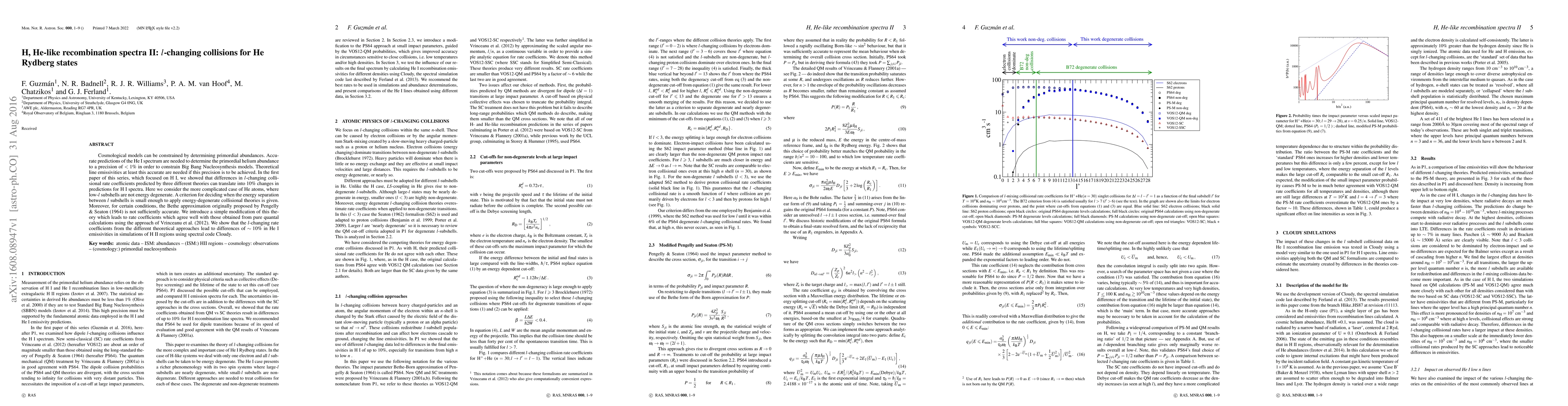 Cosmological models can be constrained by determining primordial abundances. Accurate predictions of the He I spectrum are needed to determine the primordial helium abundance to a precision of $< 1$% in order to constrain Big Bang Nucleosynthesis models. Theoretical line emissivities at least this accurate are needed if this precision is to be achieved. In the first paper of this series, which focused on H I, we showed that differences in $l$-changing collisional rate coefficients predicted by three different theories can translate into 10% changes in predictions for H I spectra. Here we consider the more complicated case of He atoms, where low-$l$ subshells are not energy degenerate. A criterion for deciding when the energy separation between $l$ subshells is small enough to apply energy-degenerate collisional theories is given. Moreover, for certain conditions, the Bethe approximation originally proposed by Pengelly & Seaton (1964) is not sufficiently accurate. We introduce a simple modification of this theory which leads to rate coefficients which agree well with those obtained from pure quantal calculations using the approach of Vrinceanu et al. (2012). We show that the $l$-changing rate coefficients from the different theoretical approaches lead to differences of $\sim 10$% in He I emissivities in simulations of H II regions using spectral code Cloudy.