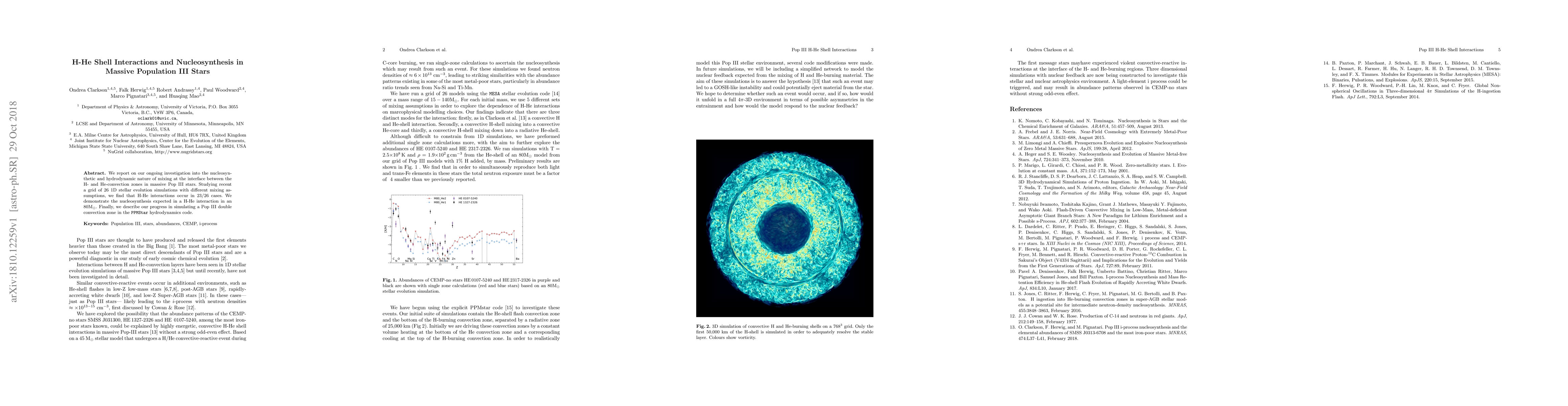 This study investigates H-He shell interactions and nucleosynthesis in massive Population III stars, revealing that such interactions occur in most simulated cases. The research also highlights the progress in simulating double convection zones using the PPMStar hydrodynamics code.