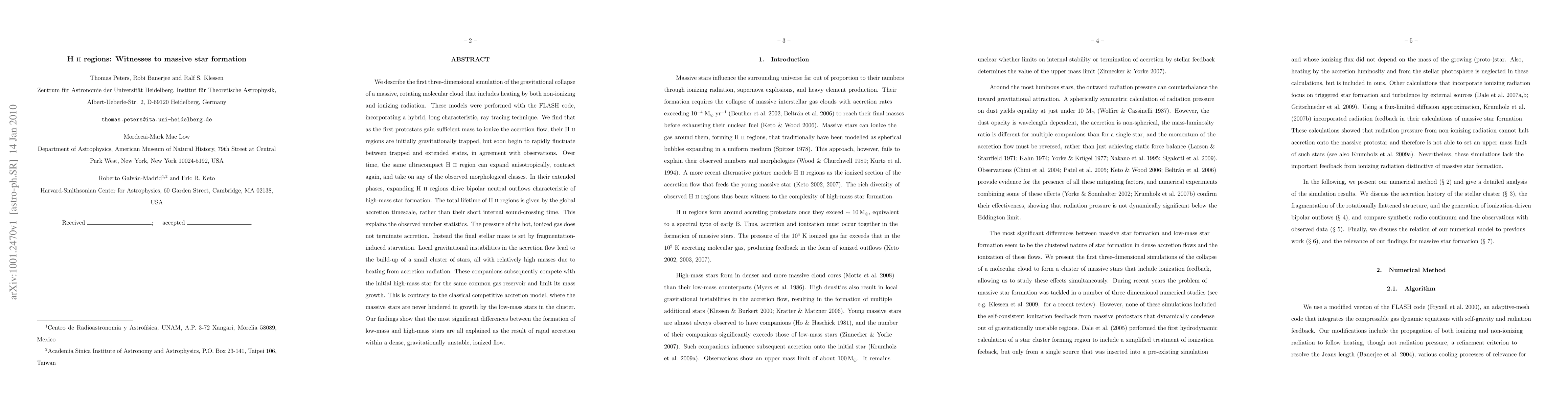 We describe the first three-dimensional simulation of the gravitational collapse of a massive, rotating molecular cloud that includes heating by both non-ionizing and ionizing radiation. We find that as the first protostars gain sufficient mass to ionize the accretion flow, their H II regions are initially gravitationally trapped, but soon begin to rapidly fluctuate between trapped and extended states, in agreement with observations. Over time, the same ultracompact H II region can expand anisotropically, contract again, and take on any of the observed morphological classes. In their extended phases, expanding H II regions drive bipolar neutral outflows characteristic of high-mass star formation. The total lifetime of H II regions is given by the global accretion timescale, rather than their short internal sound-crossing time. The pressure of the hot, ionized gas does not terminate accretion. Instead the final stellar mass is set by fragmentation-induced starvation. Local gravitational instabilities in the accretion flow lead to the build-up of a small cluster of stars, all with relatively high masses due to heating from accretion radiation. These companions subsequently compete with the initial high-mass star for the same common gas reservoir and limit its mass growth. Our findings show that the most significant differences between the formation of low-mass and high-mass stars are all explained as the result of rapid accretion within a dense, gravitationally unstable, ionized flow.