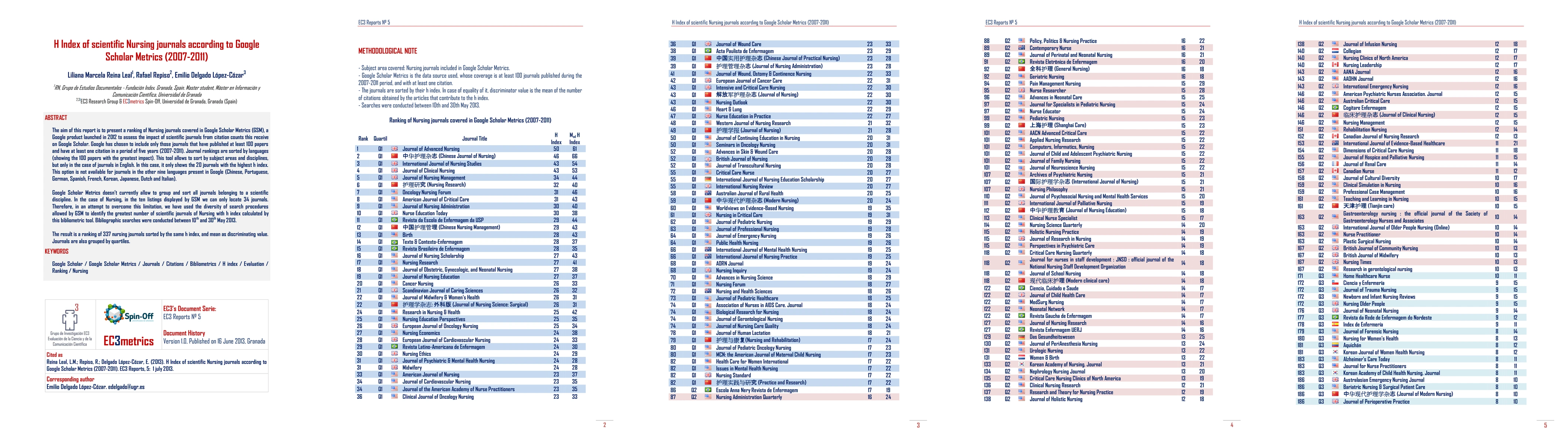 The aim of this report is to present a ranking of Nursing journals covered in Google Scholar Metrics (GSM), a Google product launched in 2012 to assess the impact of scientific journals from citation counts this receive on Google Scholar. Google has chosen to include only those journals that have published at least 100 papers and have at least one citation in a period of five years (2007-2011). Journal rankings are sorted by languages (showing the 100 papers with the greatest impact). This tool allows to sort by subject areas and disciplines, but only in the case of journals in English. In this case, it only shows the 20 journals with the highest h index. This option is not available for journals in the other nine languages present in Google (Chinese, Portuguese, German, Spanish, French, Korean, Japanese, Dutch and Italian). Google Scholar Metrics doesnt currently allow to group and sort all journals belonging to a scientific discipline. In the case of Nursing, in the ten listings displayed by GSM we can only locate 34 journals. Therefore, in an attempt to overcome this limitation, we have used the diversity of search procedures allowed by GSM to identify the greatest number of scientific journals of Nursing with h index calculated by this bibliometric tool. Bibliographic searches were conducted between 10th and 30th May 2013. The result is a ranking of 337 nursing journals sorted by the same h index, and mean as discriminating value. Journals are also grouped by quartiles.