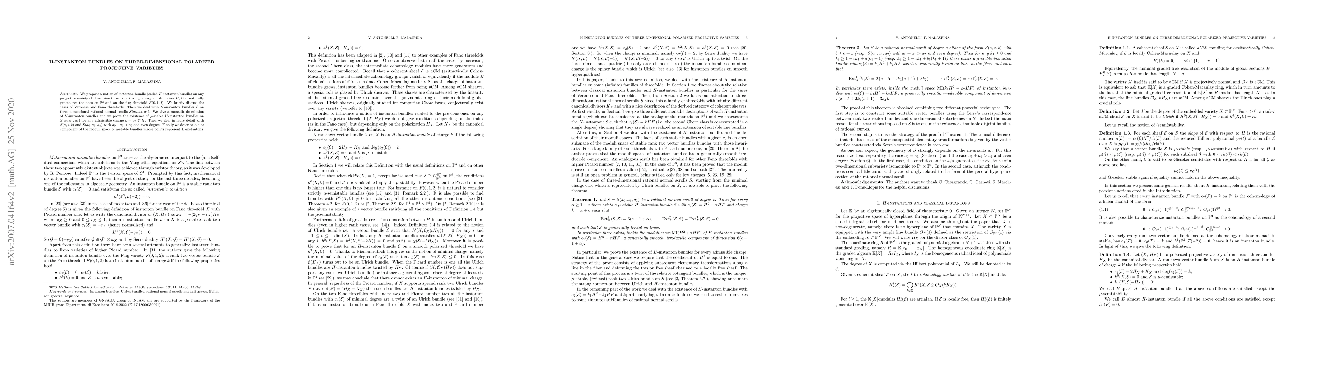 This paper introduces $H$-instanton bundles on three-dimensional polarized projective varieties, extending the concept from $\mathbb{P}^3$ and flag threefolds. It provides a monadic description and proves the existence of $\mu$-stable $H$-instanton bundles on rational normal scrolls, focusing on specific cases and describing a nice component of the moduli space of these bundles.